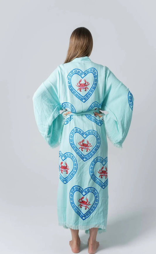 Long Caribbean Blue Robe ~ Crab Hand Pressed Motif