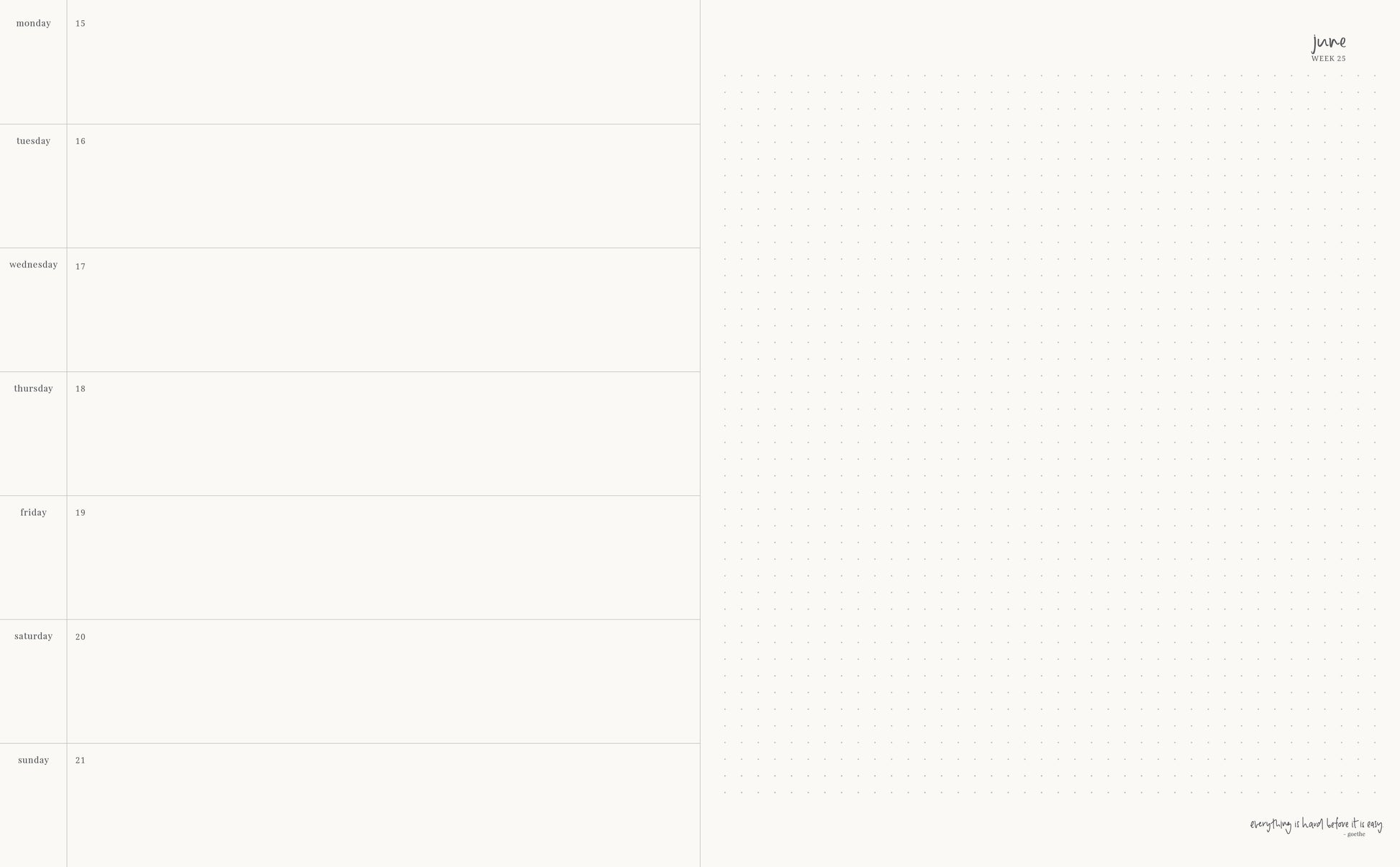 - 1 additional dot grid page at the beginning of each week, for planning [so 8 pages per 7-day week]
