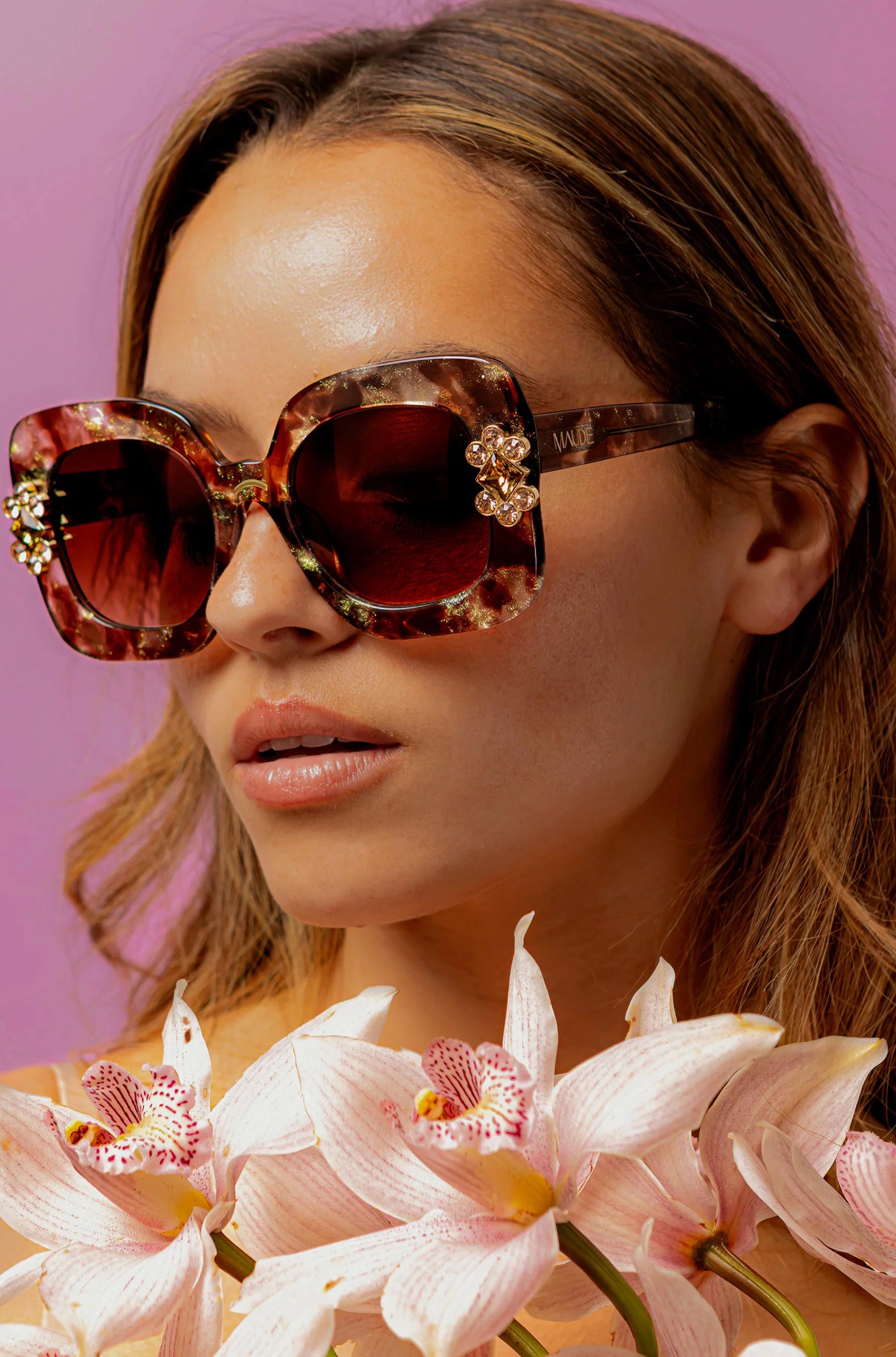 Aftersun ~ Medium sized square sunglasses in brown acetate with golden shimmer and bold crystal flower details