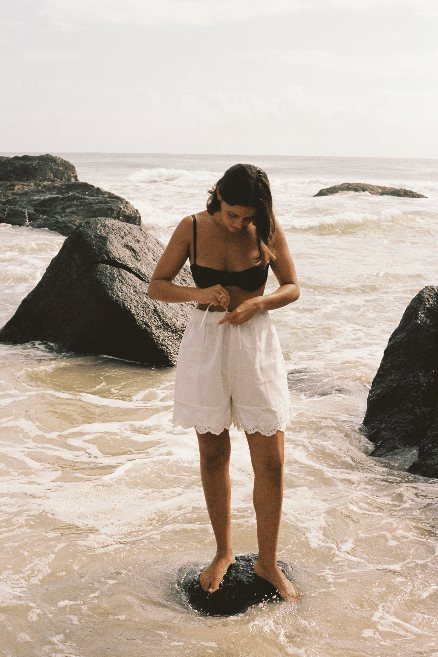 Soft cotton poplin with a scalloped broderie hem and mid-thigh length. A relaxed drawstring waist makes these the perfect throw-on for long mornings or warm evenings.