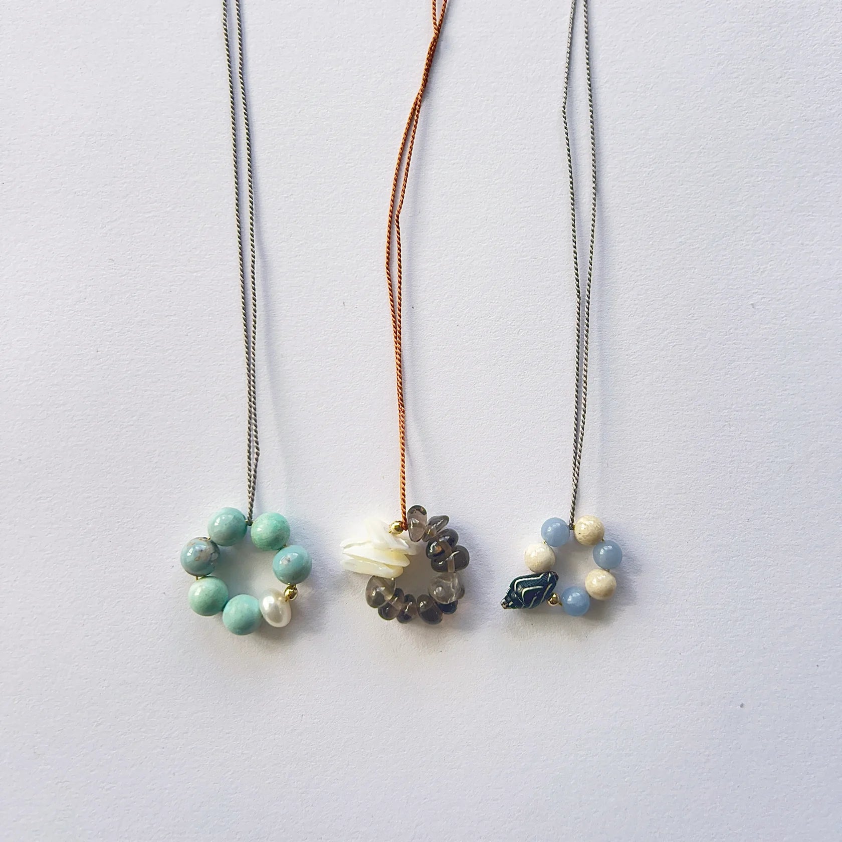 A selection of gemstone bead rings strung on silk thread. Please contact us for availble gems/colours.