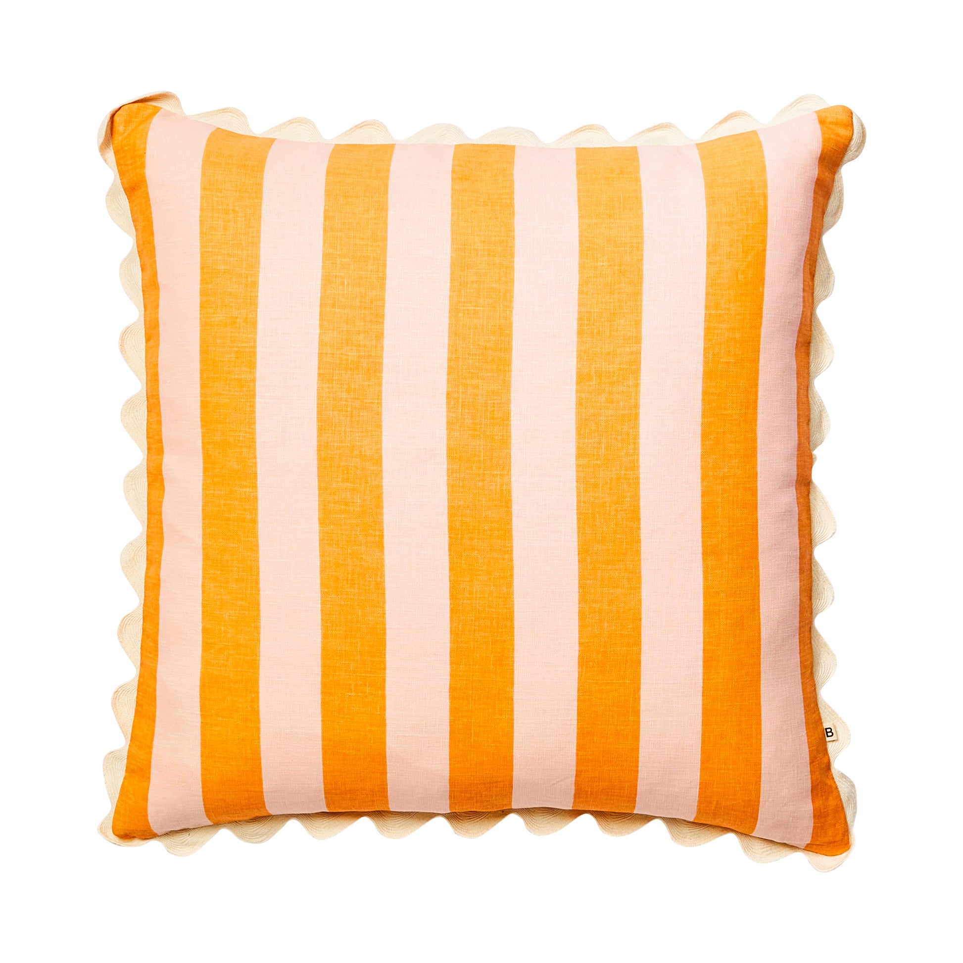 Bold Stripe Orange Pink 60cm cushion features original artwork by Bonnie printed on white linen. The reverse of the cushion features the same design printed on oat linen.