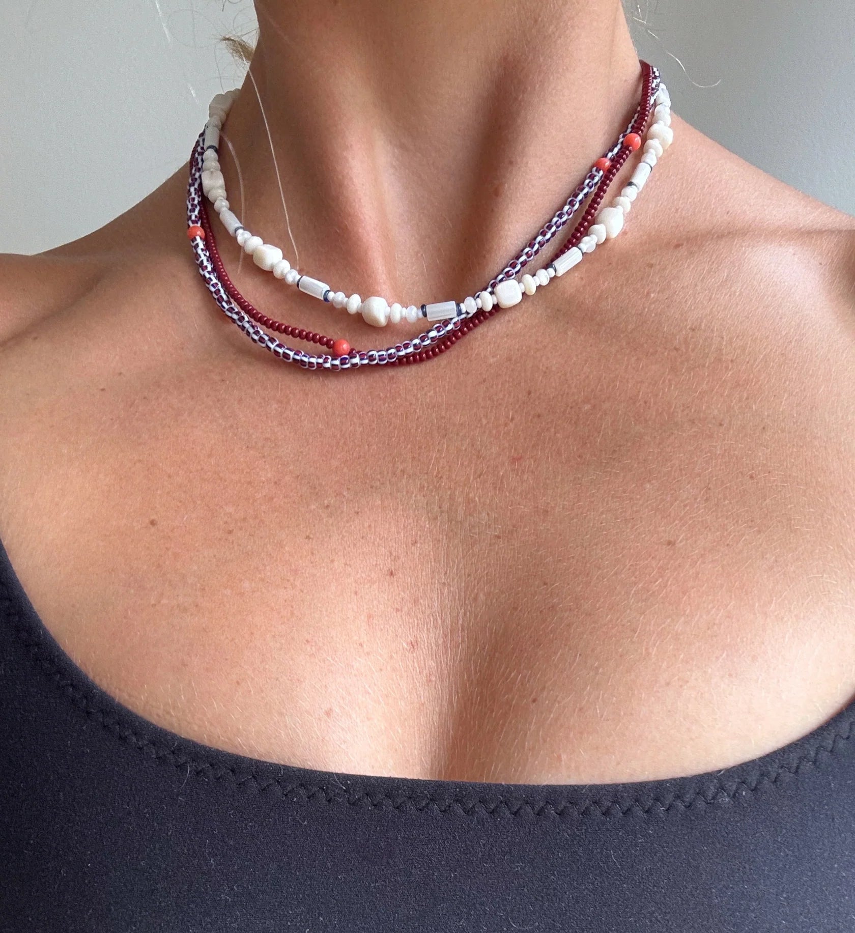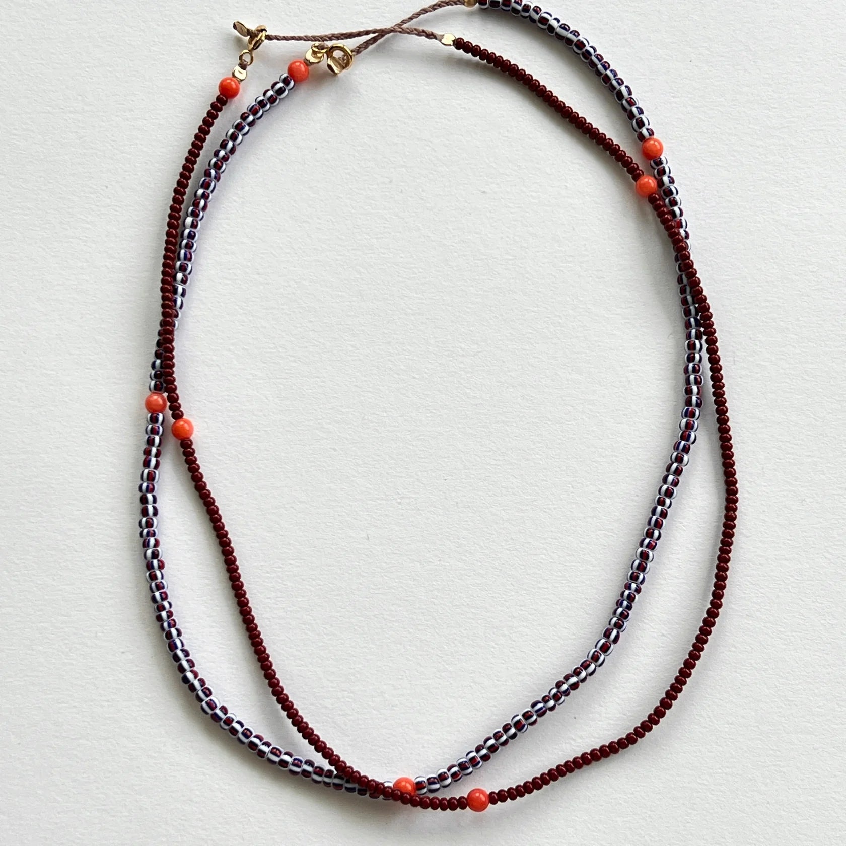 Burgundy necklace is a beautiful line of colour with a scattering of orange coral. Perfect worn alone or add to a gemstone stack. Choose from a line of burgundy or stripe.