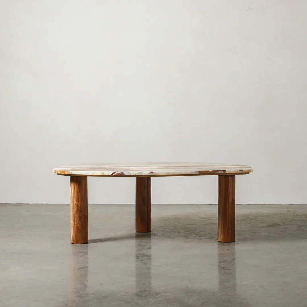 Indulge in the captivating allure of the Clifton Table, a marble top coffee table that exudes luxury and sophistication. Its unique irregular shape, characterized by organic smooth lines and a rounded rectangular silhouette, adds a touch of artistic charm to your living space. The Clifton Table stands on three column-shaped wooden legs, providing both stability and a visually intriguing design element. These warm coloured wooden legs perfectly complement the exquisite tones in the marble top, creating a harmonious fusion of materials and textures. Choose from four stunning tabletop finishes: red alicante, grey lagoon, pink lagoon and onyx travertine. Each option showcases its own distinctive beauty of the natural stone, allowing you to select the one that best complements your interior style and creates a captivating focal point in your space. The Clifton Table can be coupled with the slightly taller Waverly Table, creating a cohesive and stylish pairing that elevates your interior decor.