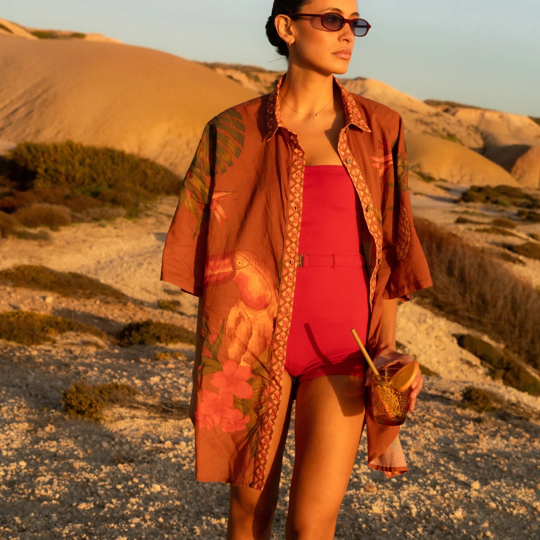 Made from soft organic cotton, this shirt features hand-drawn tropical motifs — toucans, gold pineapples, and bird of paradise flowers.