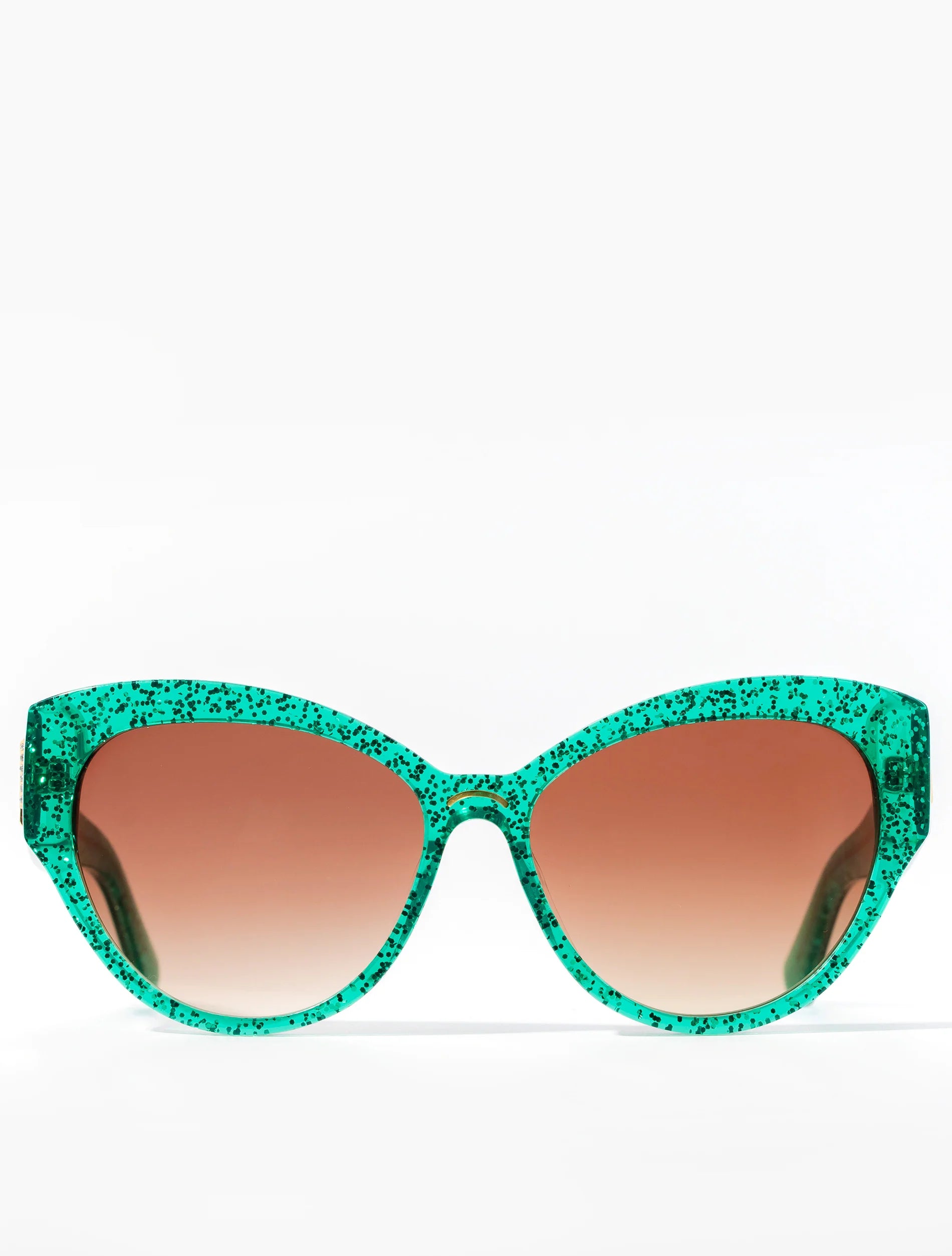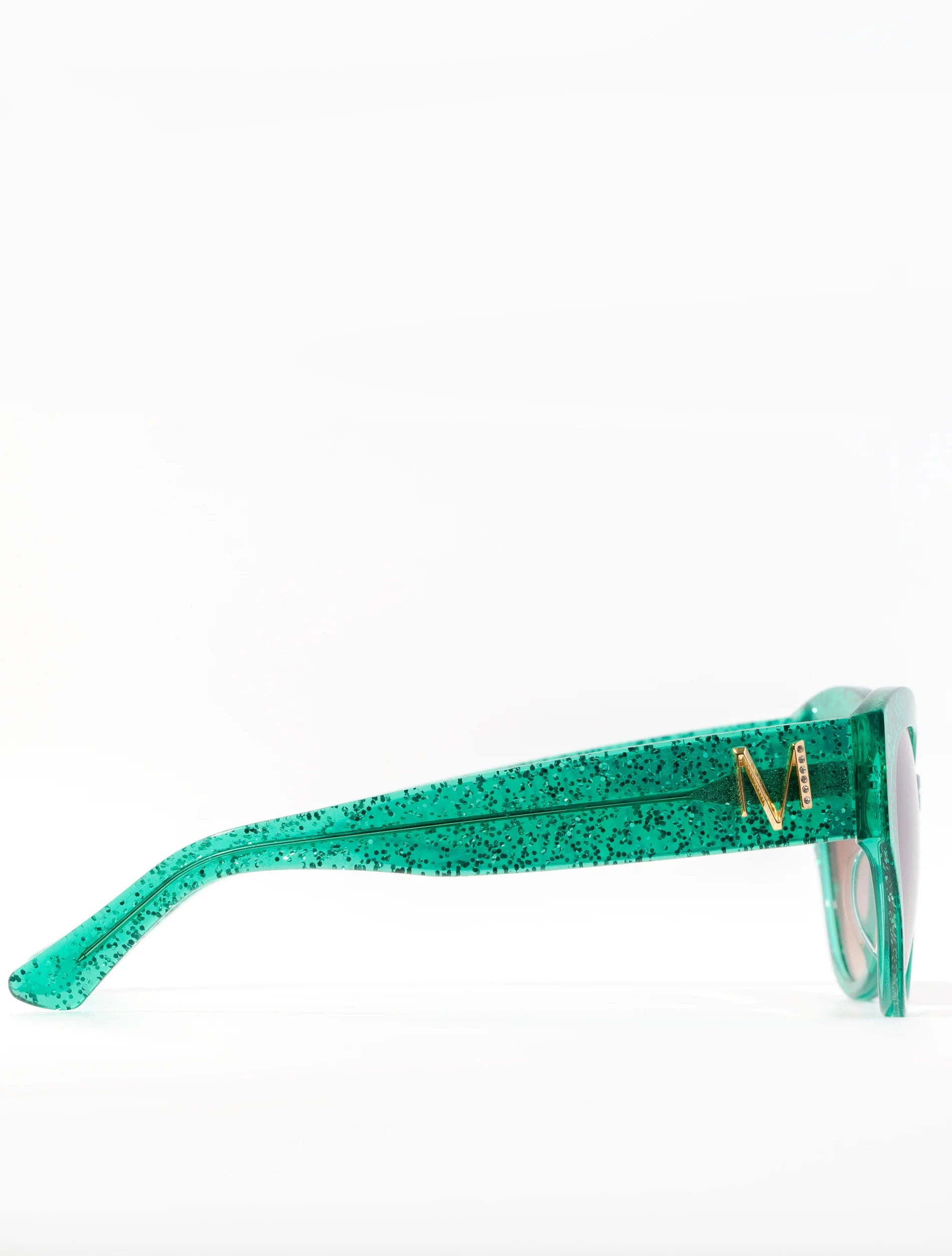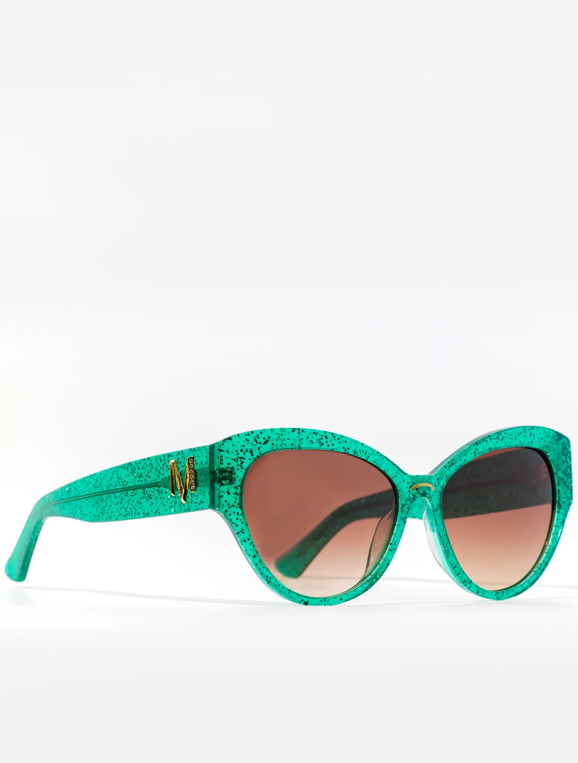 Emerald glitter acetate frames with shaded black CR39 lenses. A gold metal 'M' insignia is studded with tiny crystals, decorating each arm.