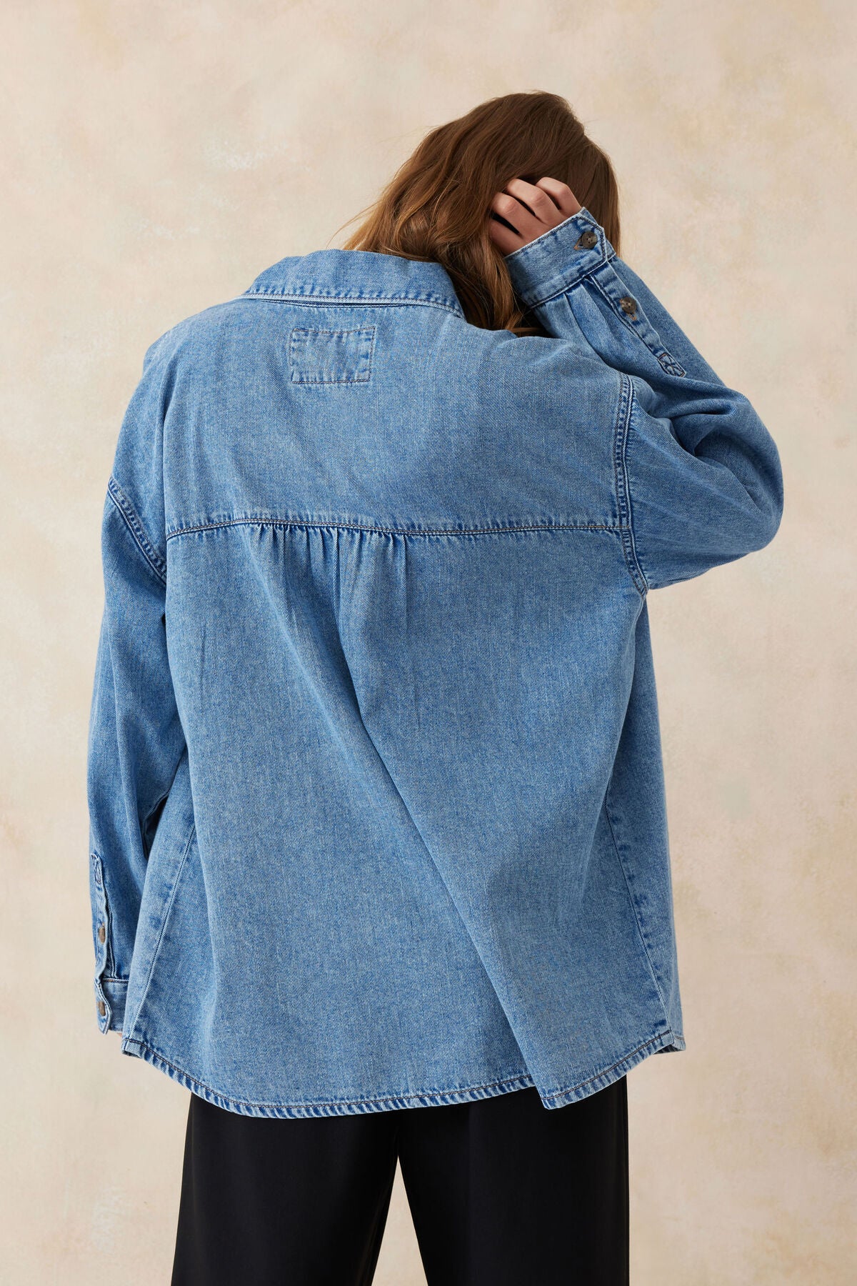 Cut in 100% organic cotton, this denim shirt is a season-less must have. Versatile styling options make this an easy wear wardrobe work horse. Give your everyday double denim or soft suiting look a modern edge.
