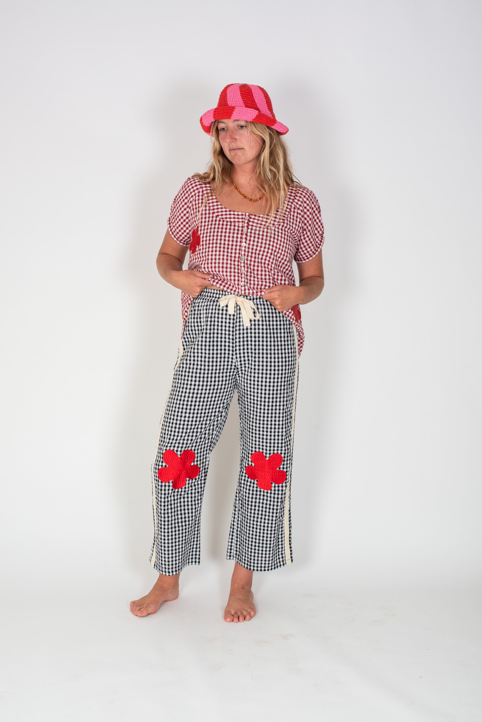 Pull-on pants with a playful spirit and a perfect fit. The Posy Gingham Pant takes cues from our bestselling flare silhouettes, reimagined in textured cotton-linen gingham. Featuring contrast side stripes in classic canvas and vintage-style red Posy flower embroidery on the knees — because life’s too short for boring pants. No pockets, just clean lines, an easy drawstring waist, and the kind of comfort made for long travel days, slow mornings, or spontaneous beach detours.