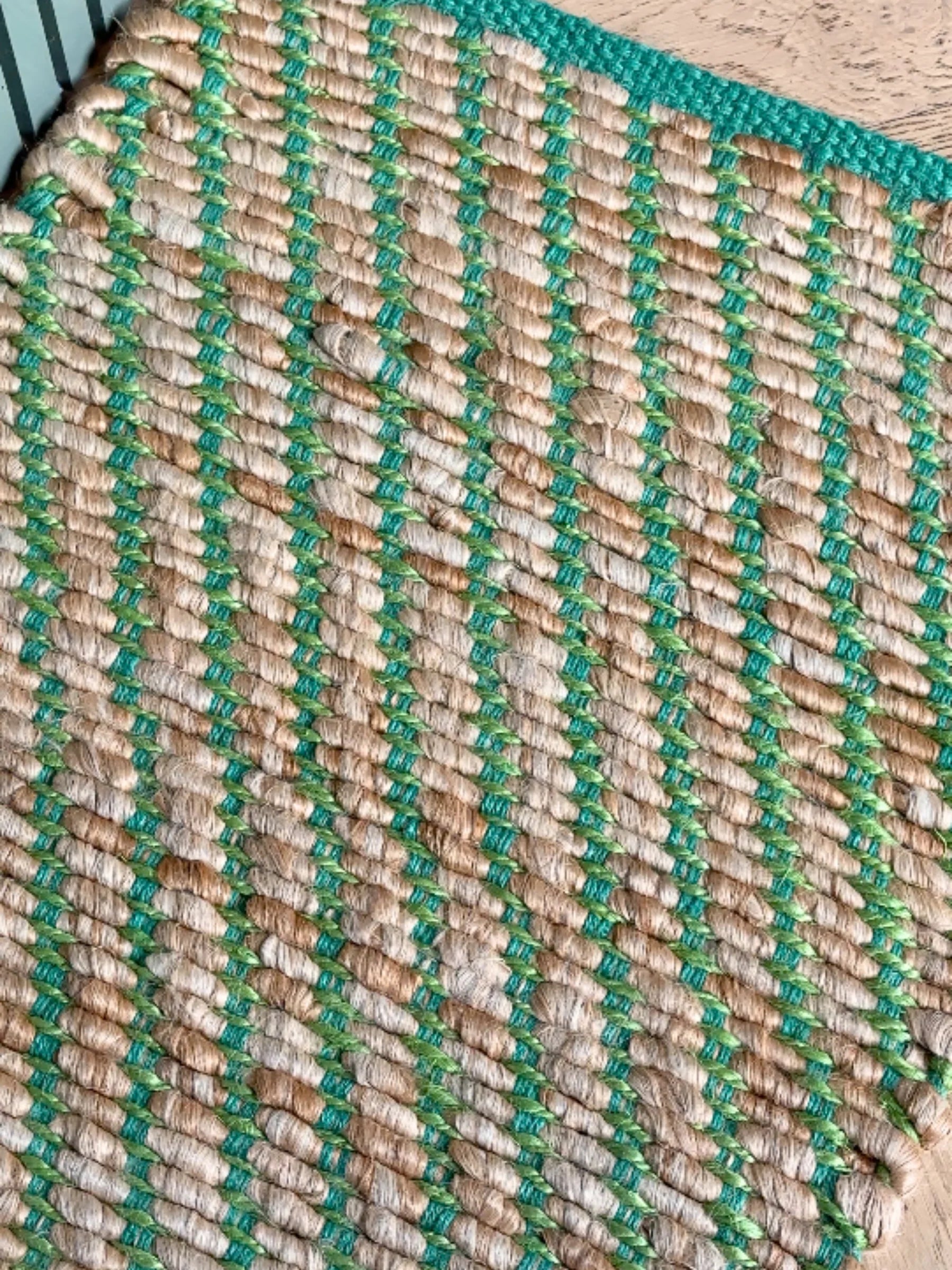 Handwoven from natural jute and finished with fresh green accents, this mat balances durability with effortless style. A grounding piece that adds a subtle touch of colour underfoot.