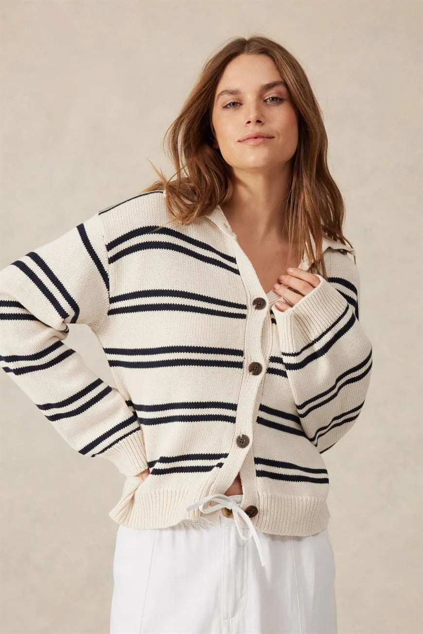 Funnel Neck Stripe Cardi Ecru Navy Stripe