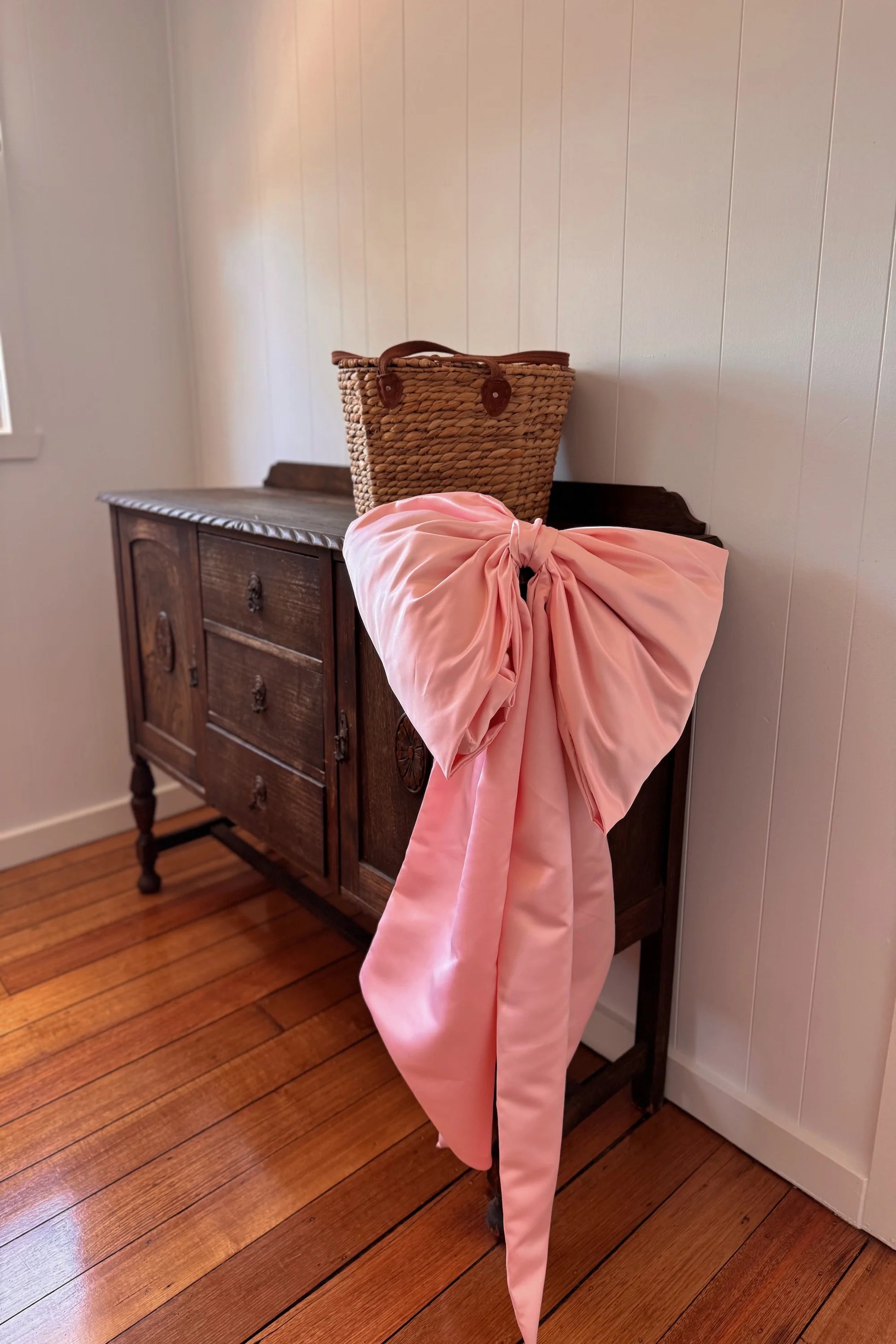 The perfect adornment to your tablescape, mantle, chair or door. Allow this giant bow to be draped from a tabletop or secured with the two laces from behind. The bow is sewn in securely without fear of being undone. Comes packaged in a satin drawstring bag, ready for the perfect gifting experience.