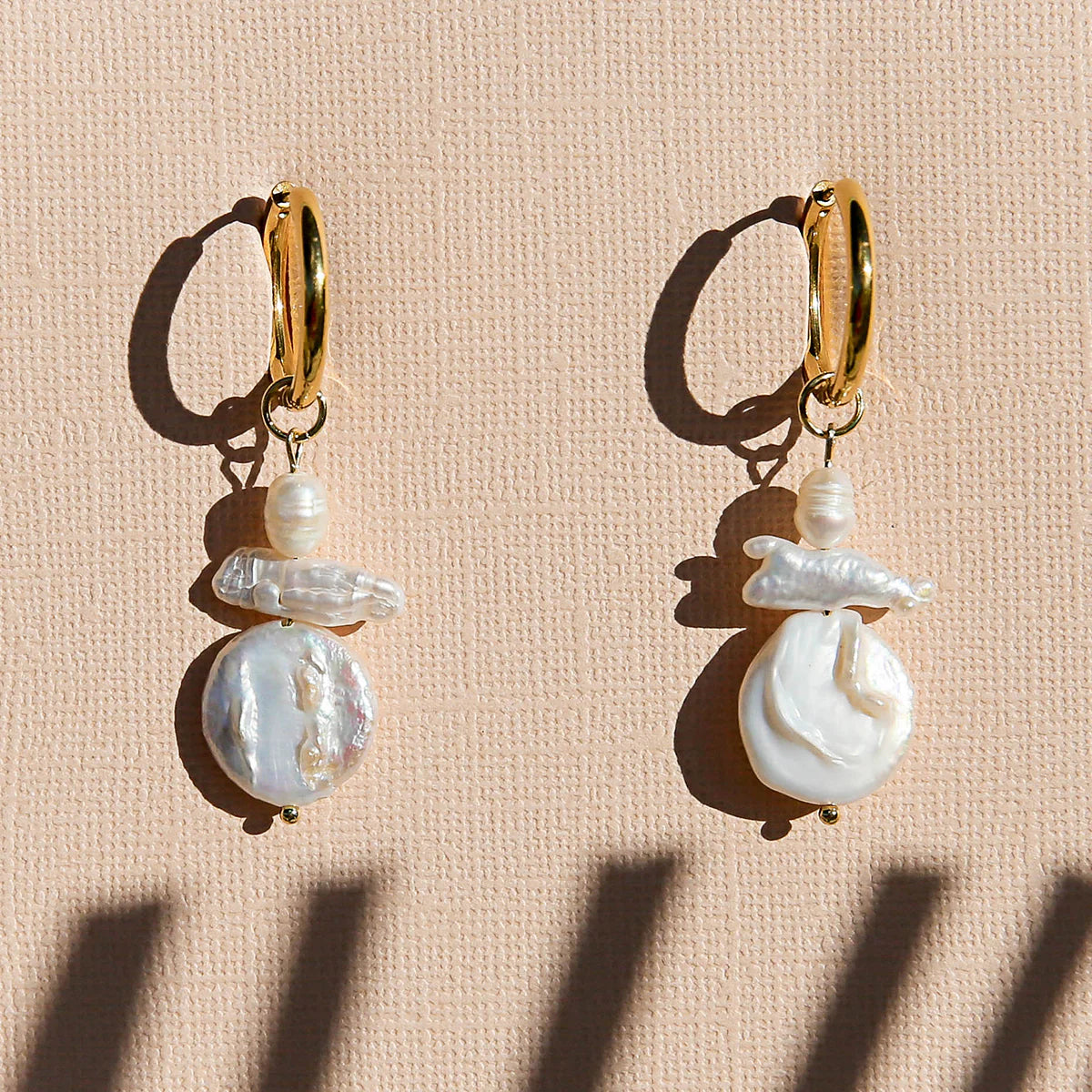 Handmade earrings on gold coated surgical steel hoops with Fresh Water Pearls.