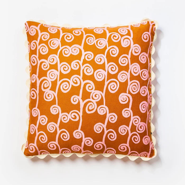 Loop Tan Pink 60cm cushion features original artwork by Bonnie printed on white linen. The reverse of the cushion features the same design.