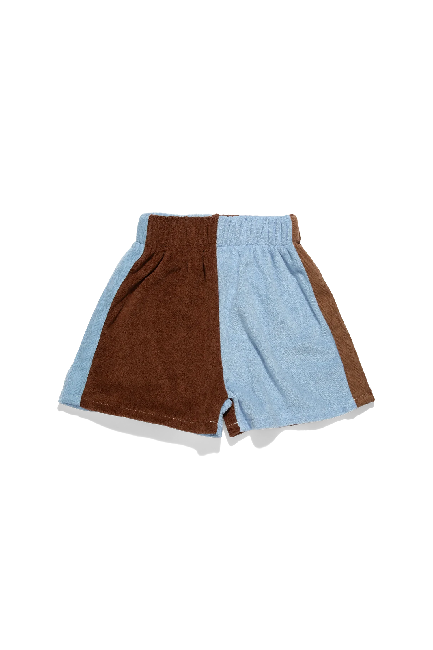 Made with 100% terry towelling fabric. A relaxed fit, with an elastic waistband for comfort. Featuring contrasting blue and chocolate and contrasting piping down each side for a playful touch.