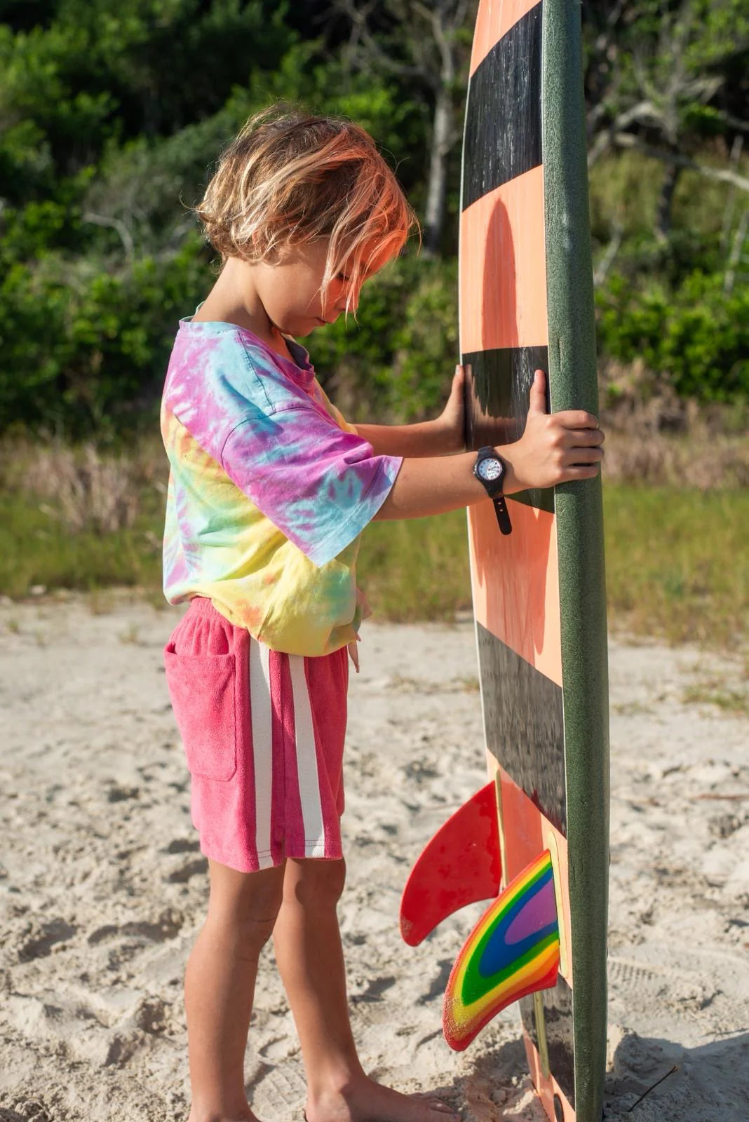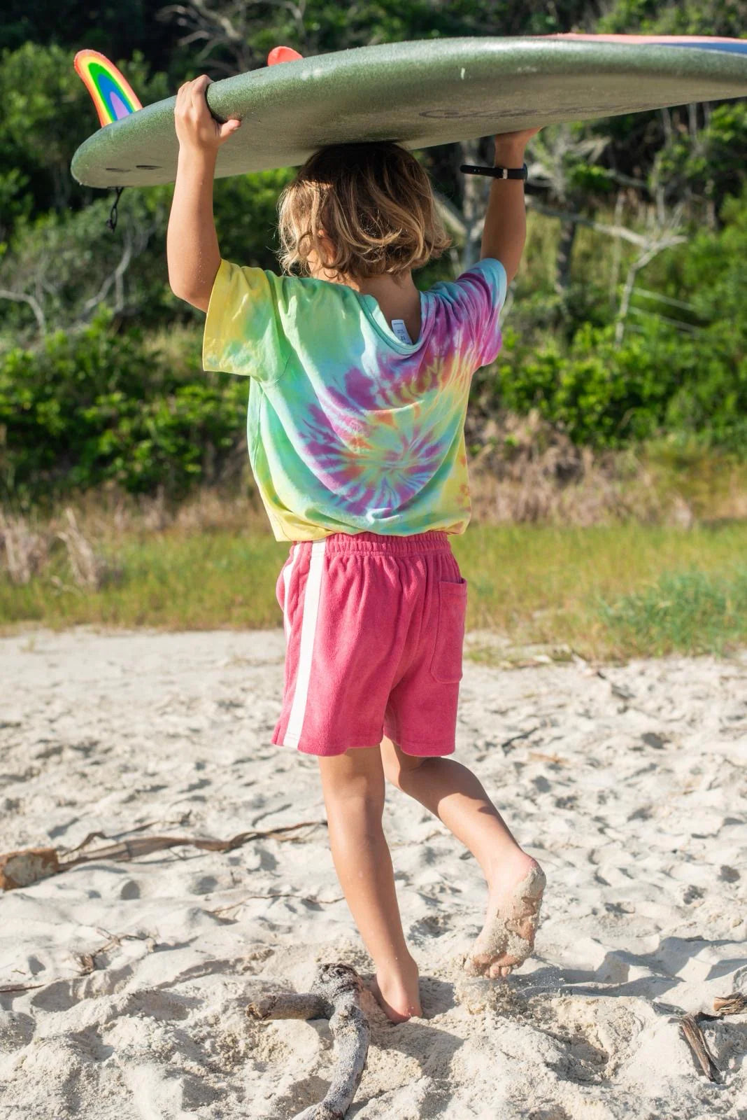 Our favourite shorts now for kids! Ready to rock n roll in the Strawberry terry towelling shorts ... Let's keep this short and sweet – these shorts are the bomb. Inspired by the groove of the 70's- they're made of 100% cotton, with a sporty stripe on the side, an elasticated waist with a drawstring, and two side slits to add even more swing to your step. We think these shorts are perfect for any time of the day or night and are so excited to be sharing them with you!