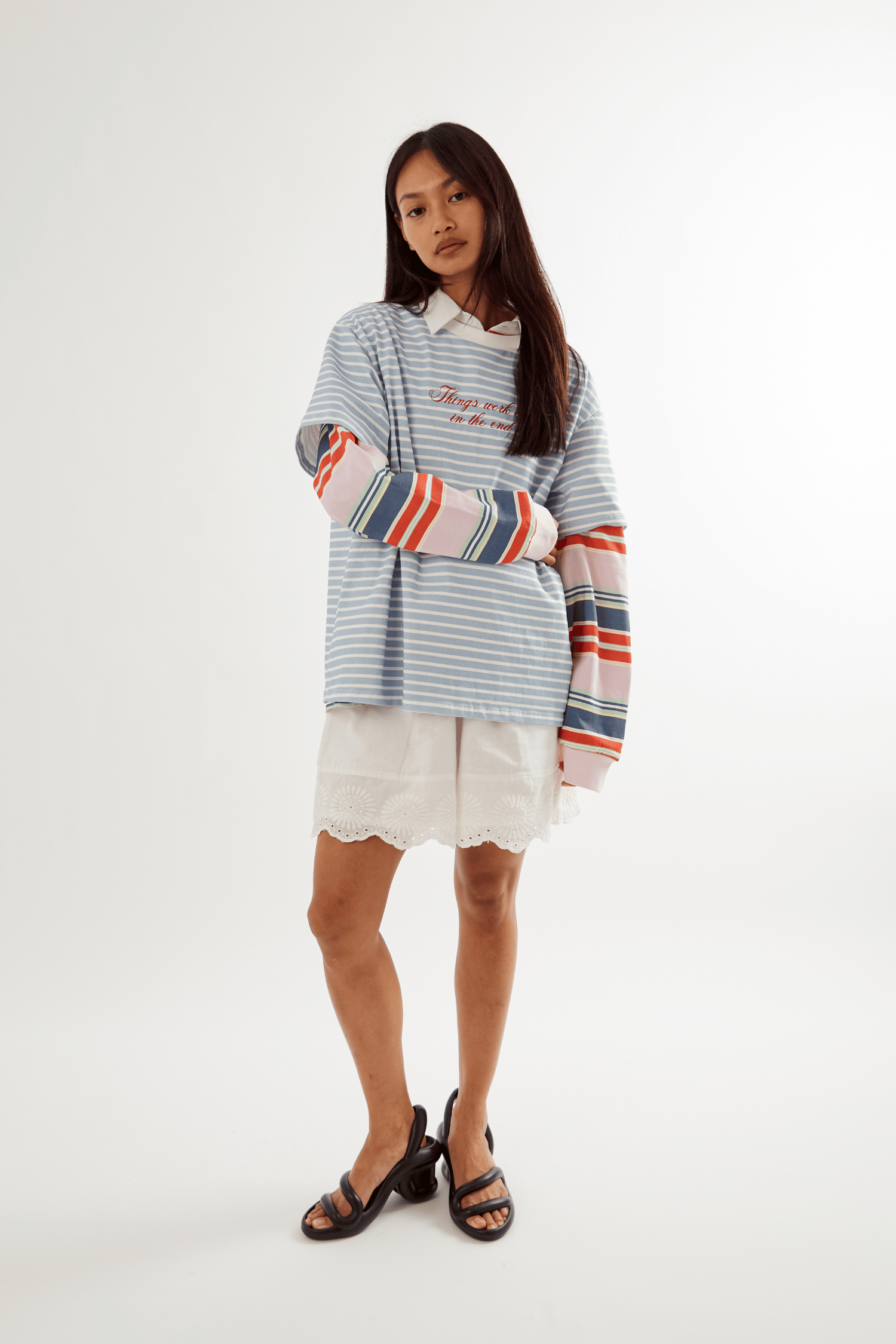 Relaxed and slightly boxy fit in soft baby-blue cotton. Finished with your reminder that Things Work Out In The End.