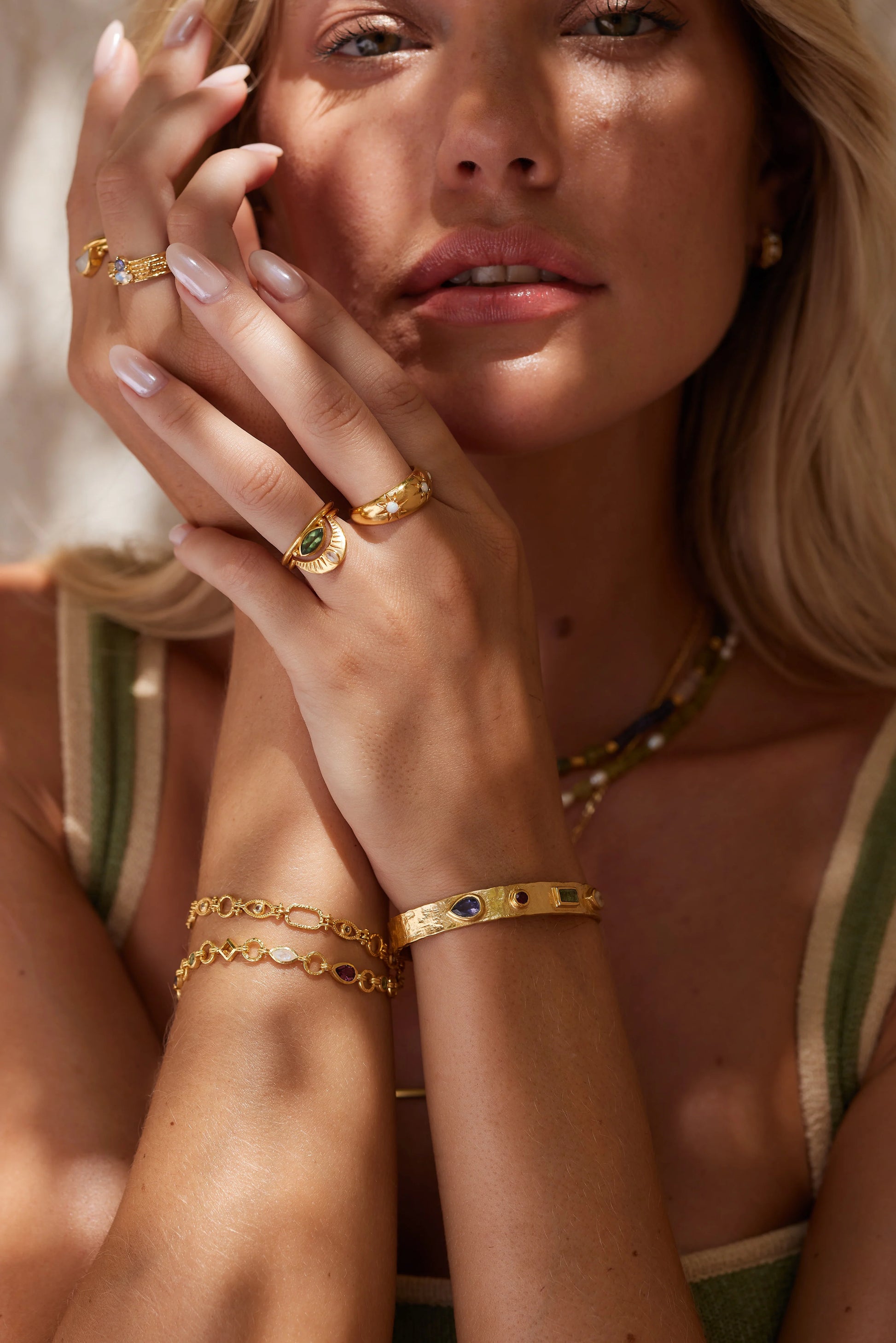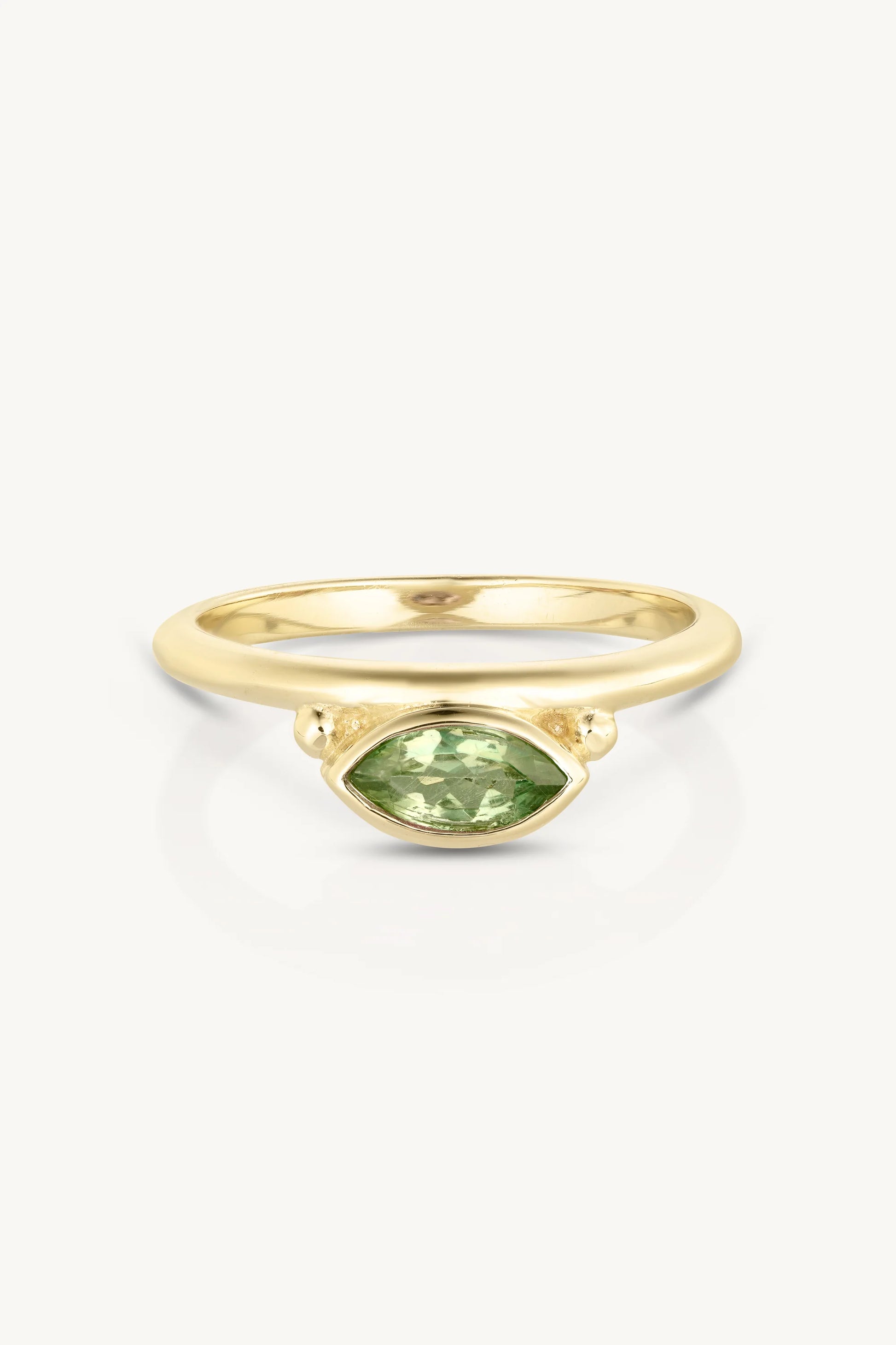 The Nyra Marquise stacker features a handcut marquise stone set with delicate ball detailing on either side of the stone.