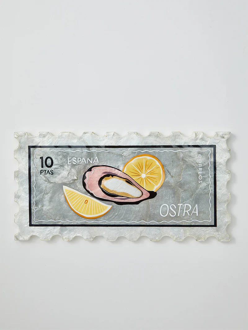 Our fun Fiesta Stamps Wall Art series, where the flavours of Spain come to life with hand-drawn and hand-painted designs on authentic capiz shell from the Philippines. These original artworks showcase the essence of Spanish culture with elements like fruit, oysters, and parrots arranged in stamp-like designs. Group together in a series or add to a niche wall or french hang.