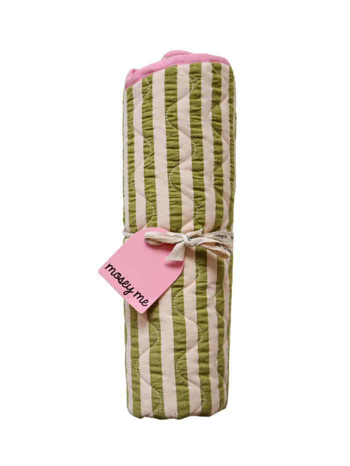 Made from 100% cotton, it features a textured pistachio and cream seersucker stripe on one side and a bold bubblegum pink cotton on the reverse - giving you two looks in one. The bubblegum piping trim and wavy quilting pattern add extra personality, while the 320gsm cotton wadding fill ensures it's plush, soft, and comfortable for little ones to stretch, roll, or snooze on.