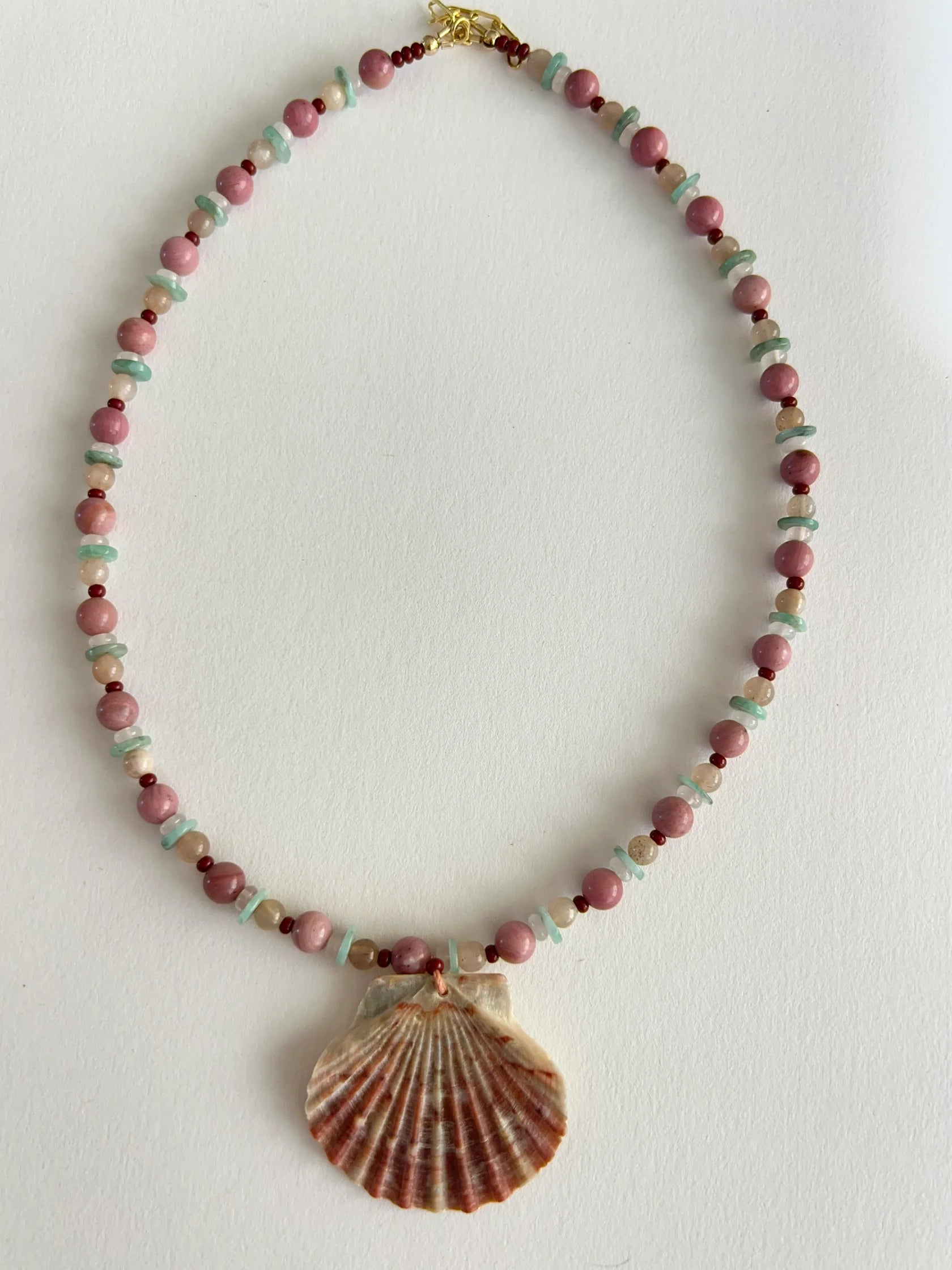 The Rhodie Necklace is a beautiful cocktail of gemstones Rhodonite , Aventurine , Red Moonstone & Jade finished with a fan shell pendant.