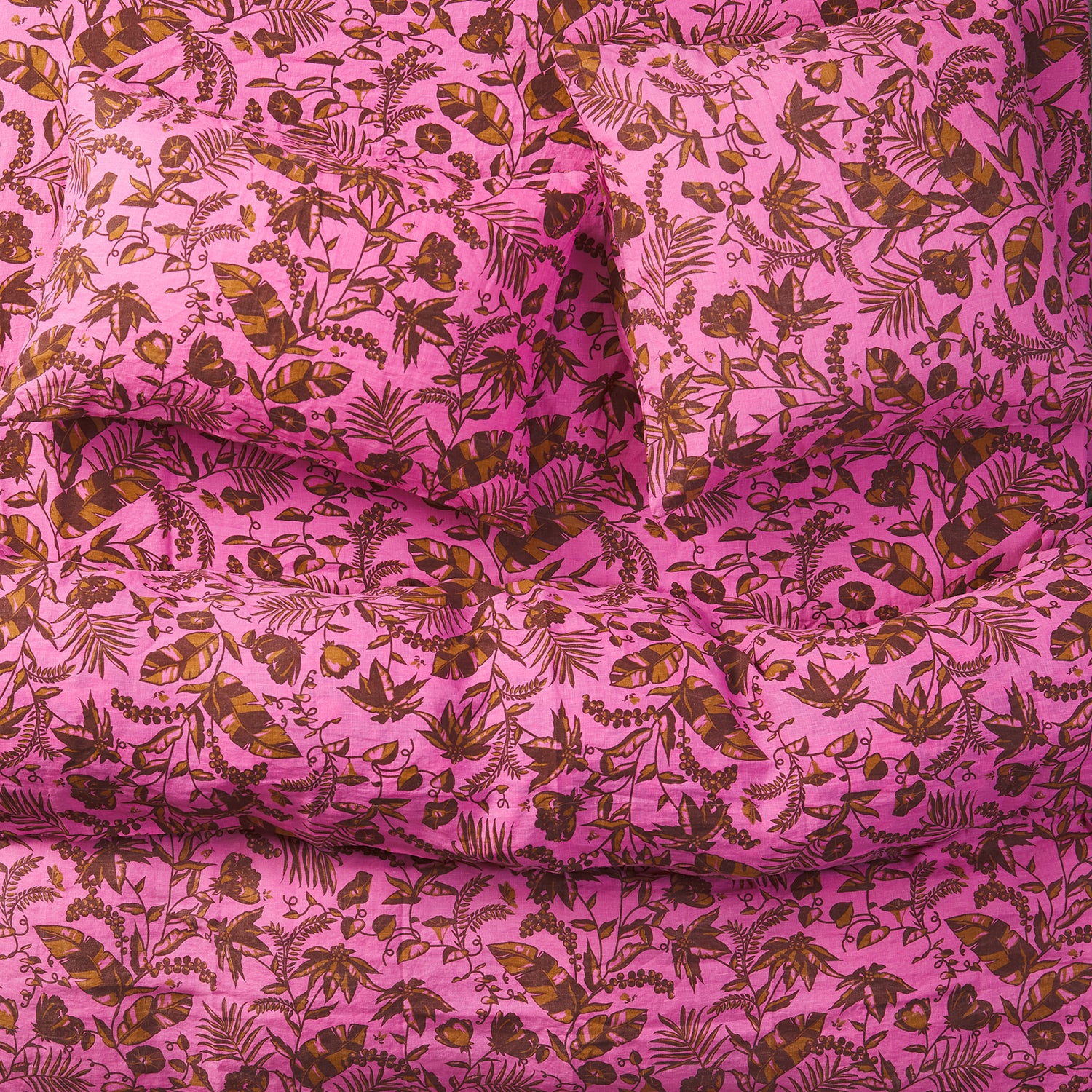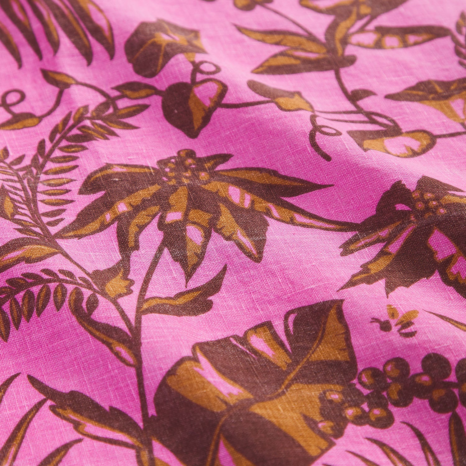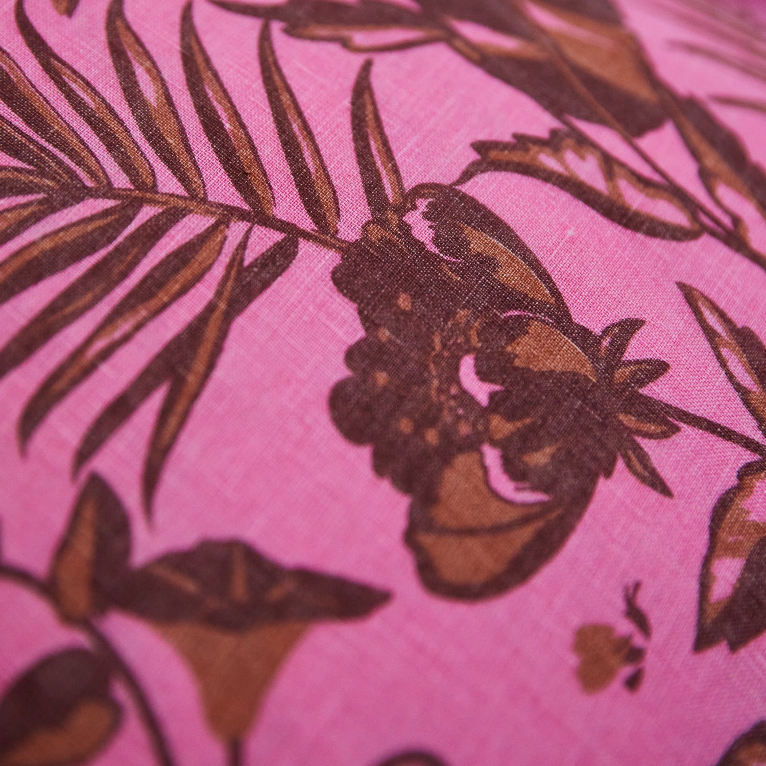 “Escape to exotic destinations with this opulent tropical print. Our Safia linen is inspired by vintage wallpaper reminiscent of high-end hotels of Singapore in the ’70s. The design brings to mind palm trees paired with luxe chrome, rattan and marble finishes. Complete the look or lean into pattern layering for an inviting eclectic vibe.” – Phoebe’s Style Notes