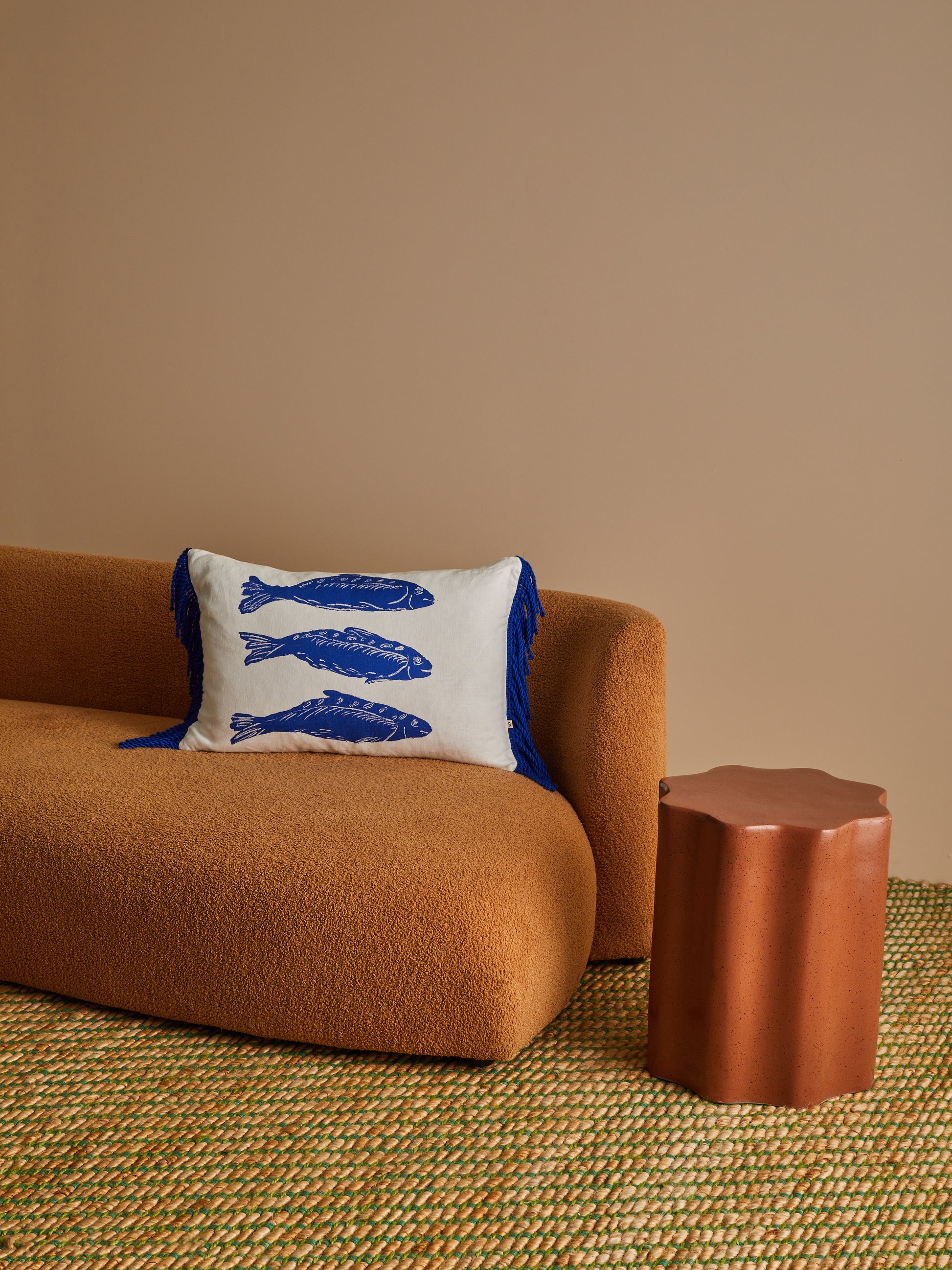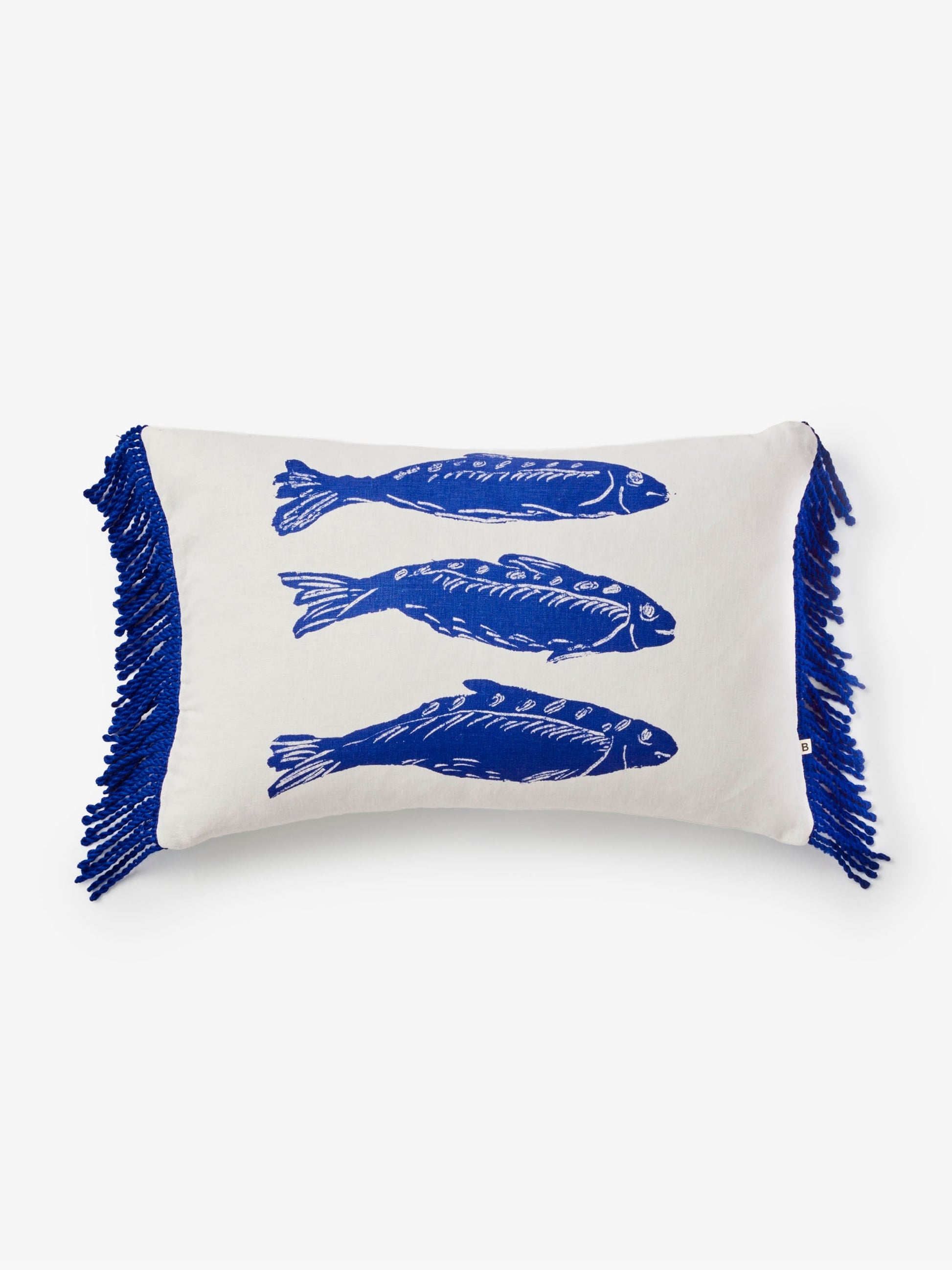 A playful linen cushion featuring hand-drawn blue sardines, finished with soft fringing. Light-hearted and unmistakably Mediterranean, this fish motif adds a coastal feel to any space.