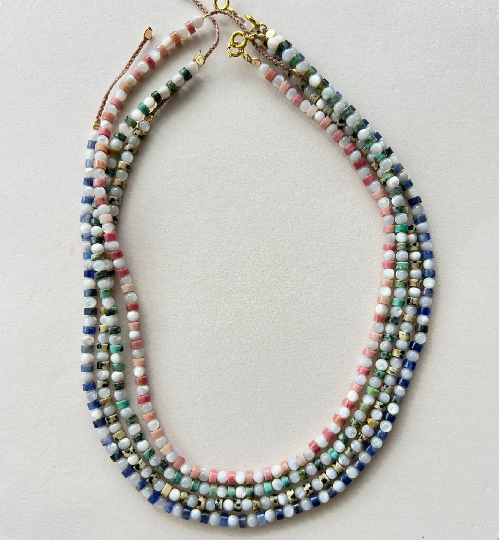 Shifting tones of mother of pearl & heishi gemstone beads. This necklace is lightweight, easy to layer, and designed for everyday wear. Each colorway brings its own rhythm - whether you’re drawn to ocean blues, sun-washed pinks, or earthy neutrals. Finished with gold hardware & hand braided closure for an adjustable, effortless fit.