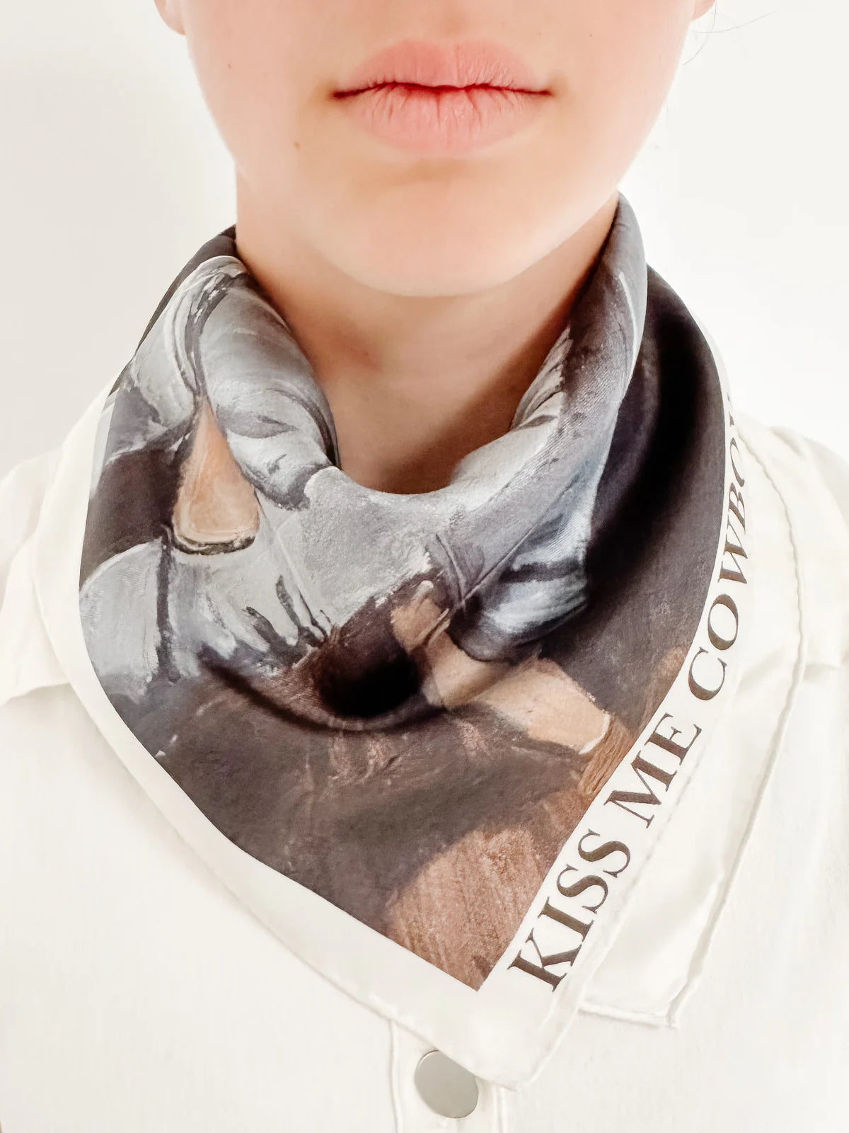 Measuring 65 x 65 cm, this 14mm Silk Twill Scarf with hand rolled edges is printed with hand painted designs by Whitney Spicer.