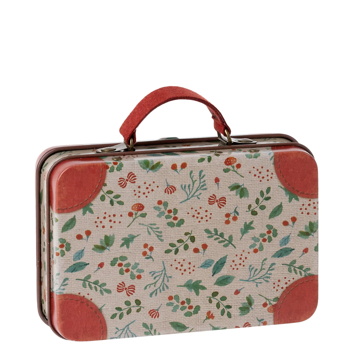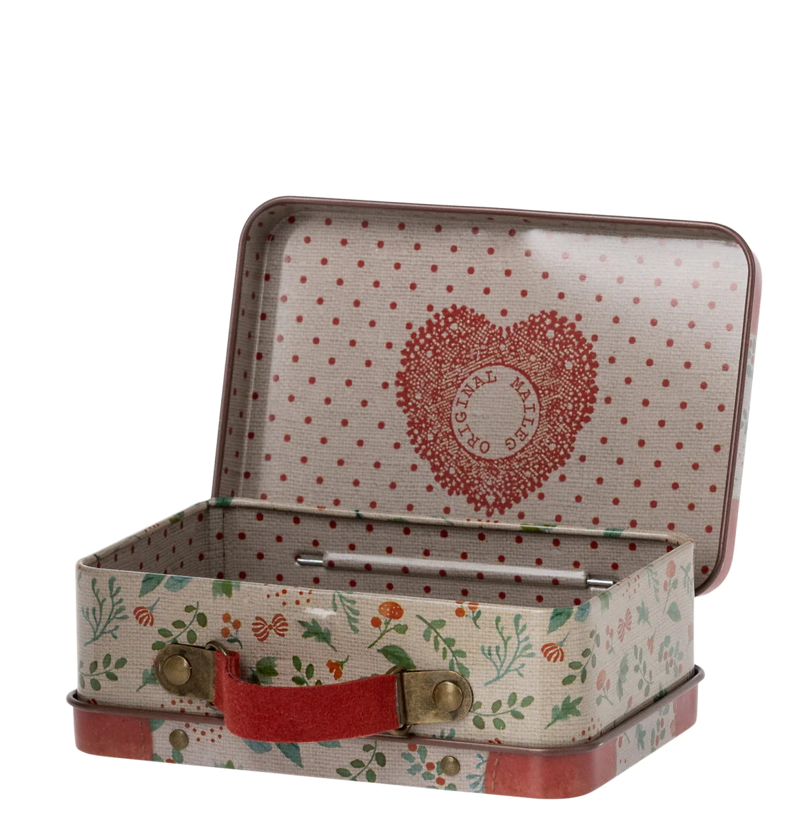 A toy metal suitcase with a beautiful print. The suitcase is not only suitable for playing but also a perfect package for a small gift or to keep small items. Measures 7cm x 11cm.