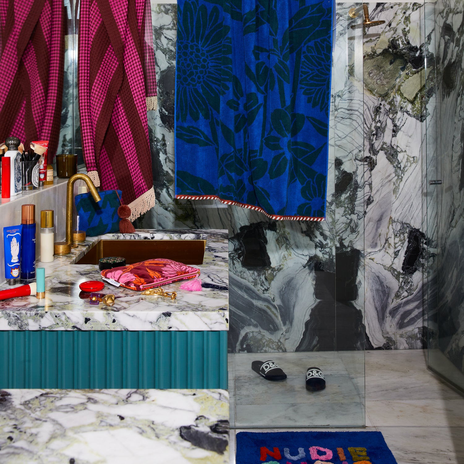 “Multiple fresh and rich colours lend an extra-uplifting feel to our cheeky and iconic Nudie Rudie slogan. This practical and playful mini design is made to bring a smile to your face every time you step out of the shower.” – Phoebe’s Style Notes