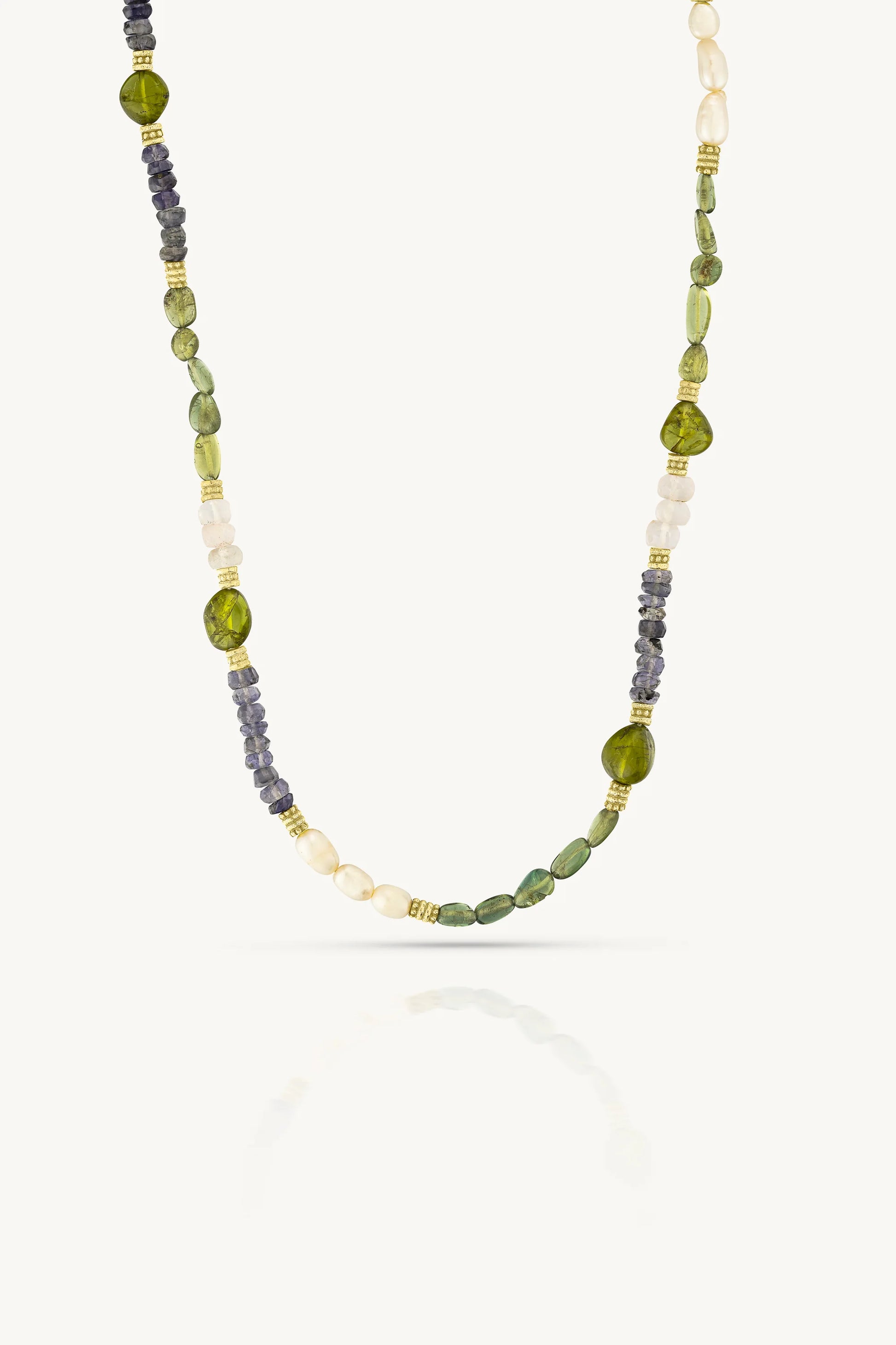 The Wren Beaded Necklace showcases a striking blend of Apatite, Iolite, Peridot, Rose Quartz and Pearl creating a harmony of greens and blues punctuated by softness.