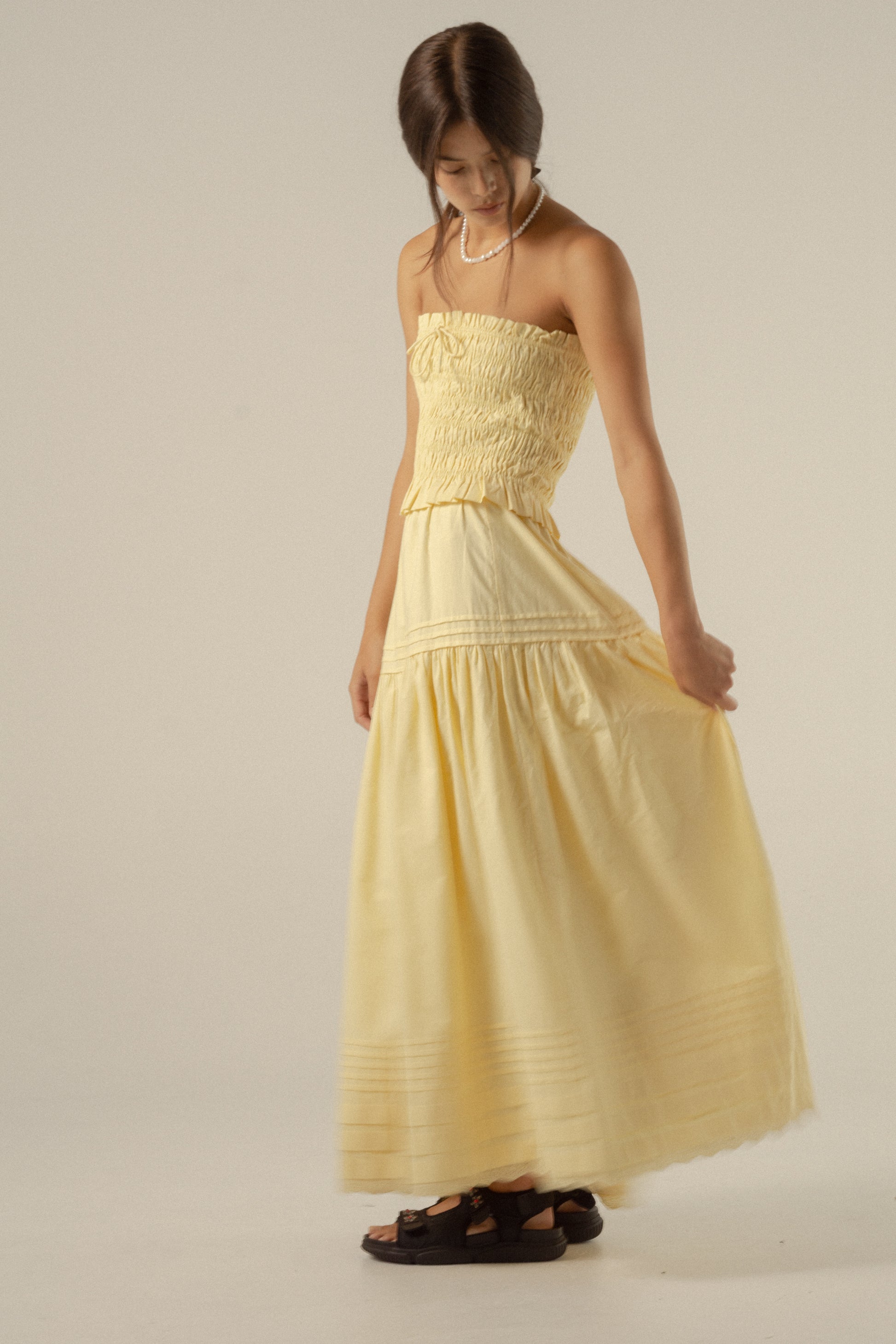 - Tiered skirt with pin-tuck details