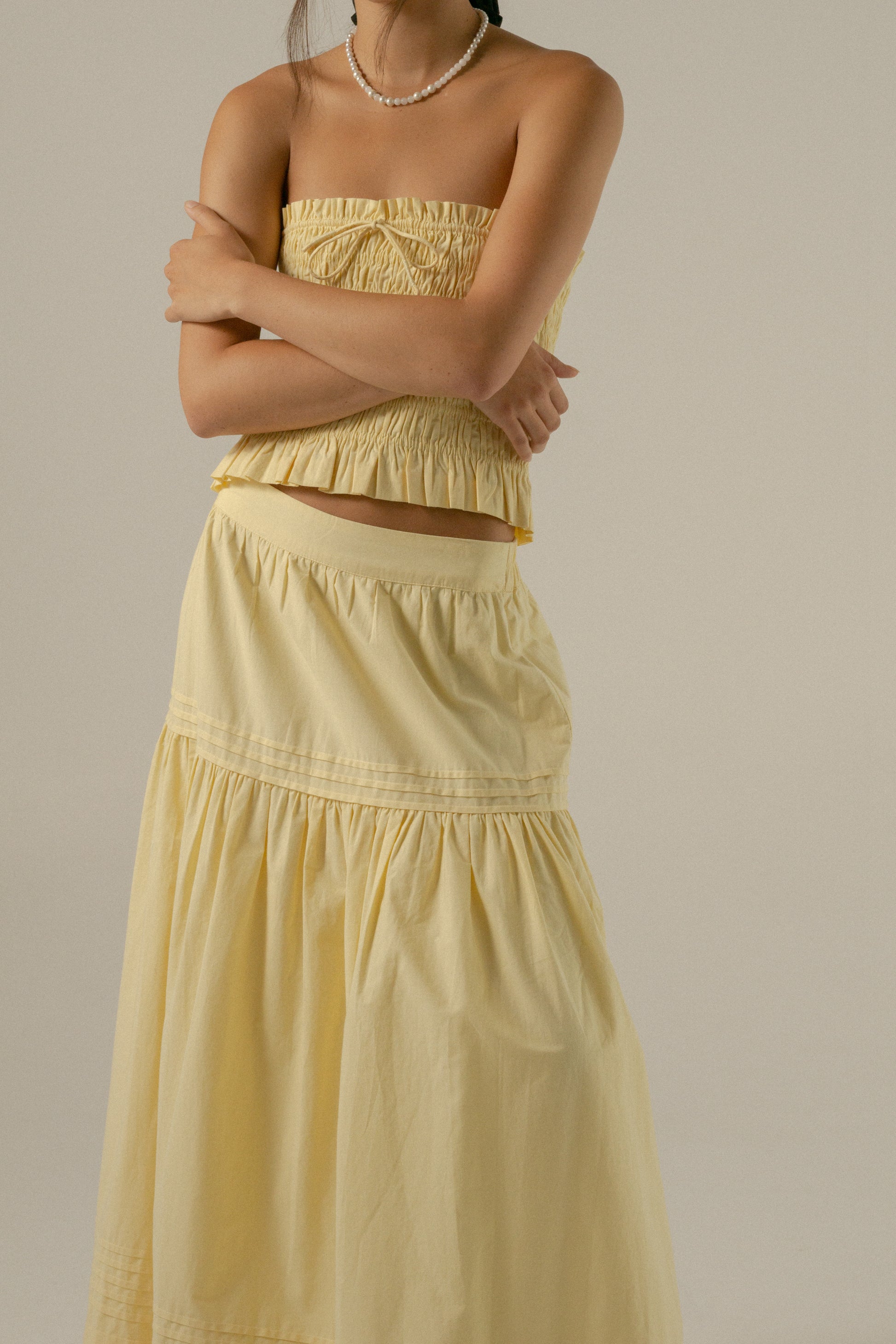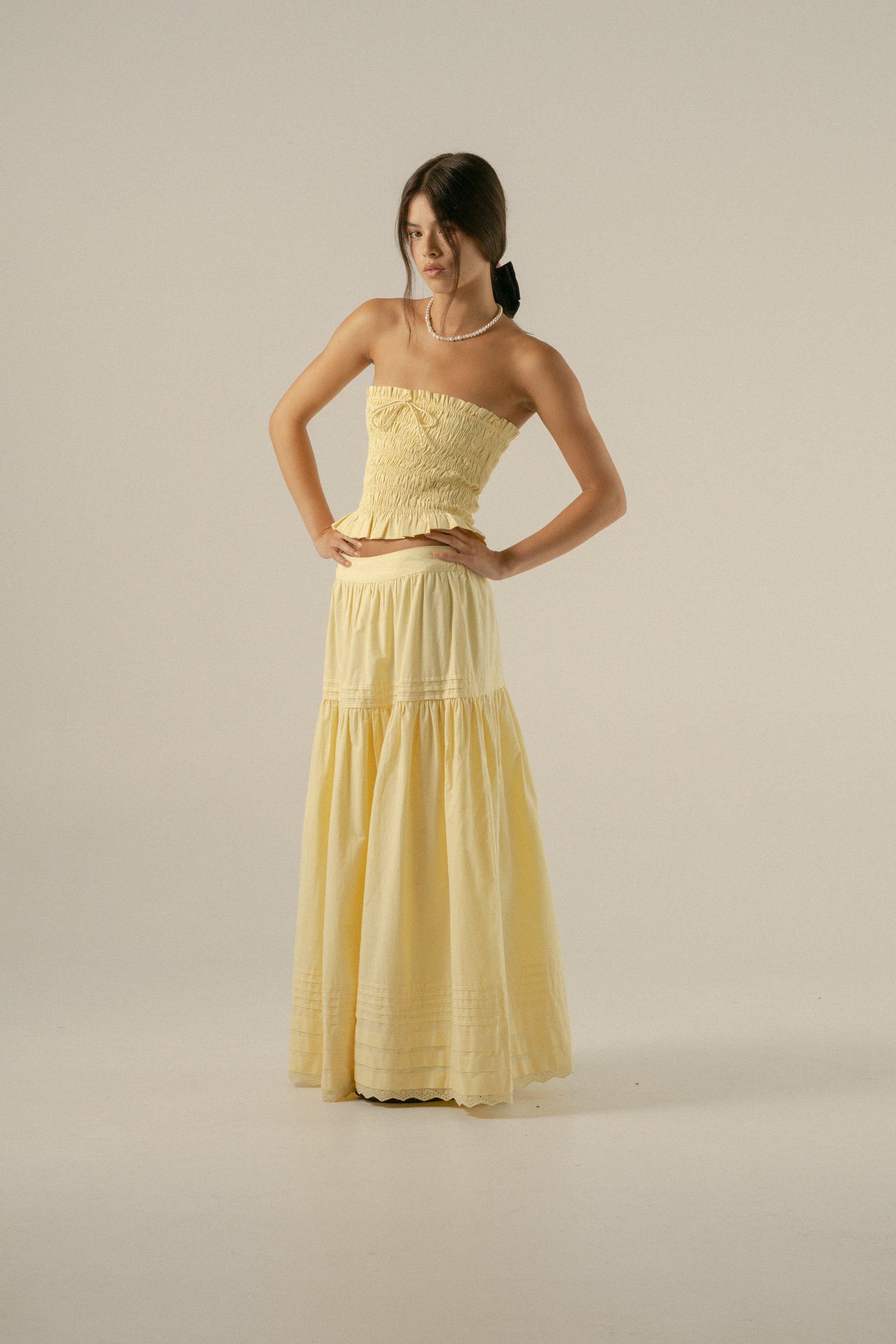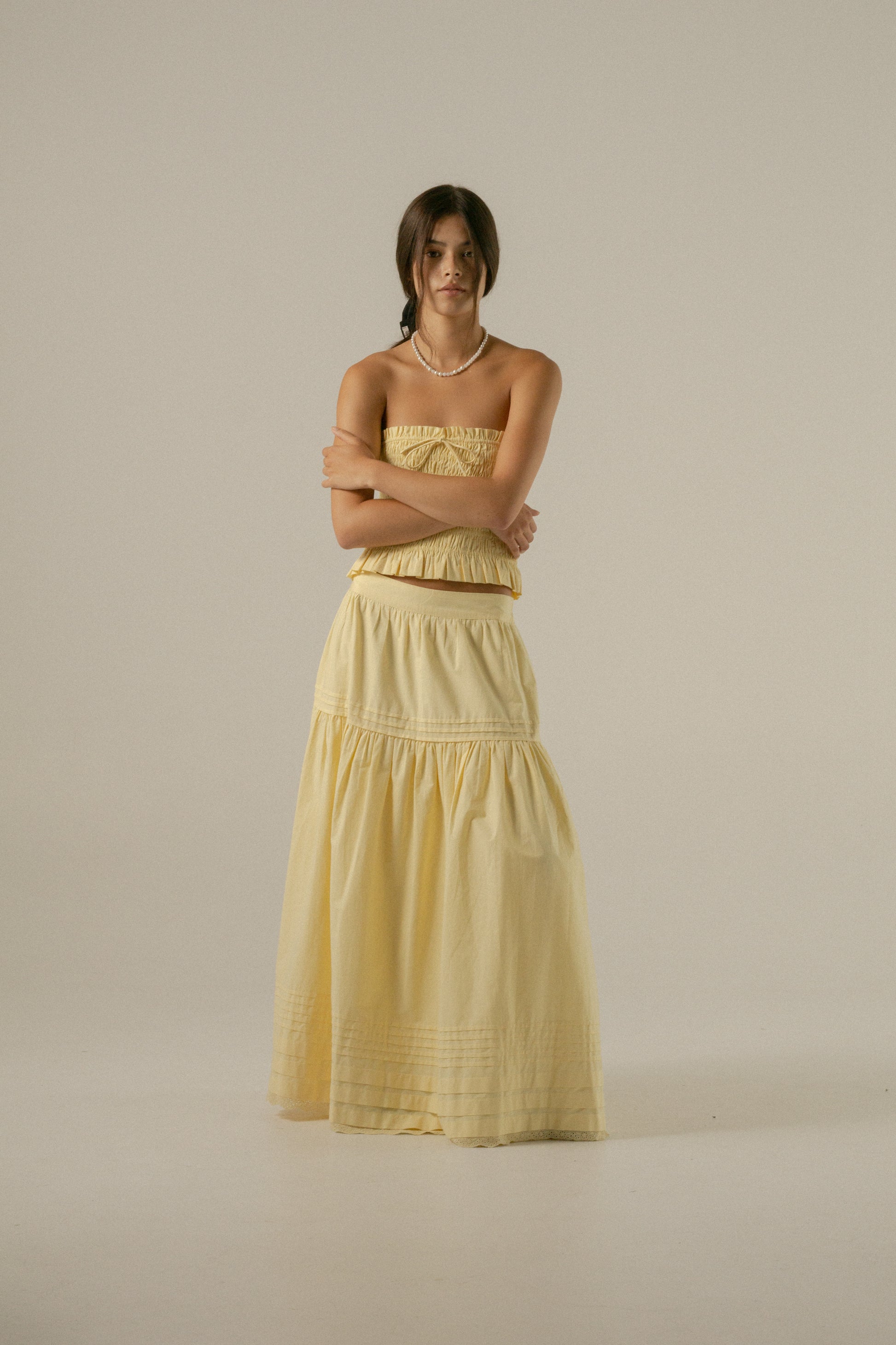 Crafted in our new Buttercup Yellow cotton poplin, the Yuri skirt is a true Heirloom treasure! Featuring